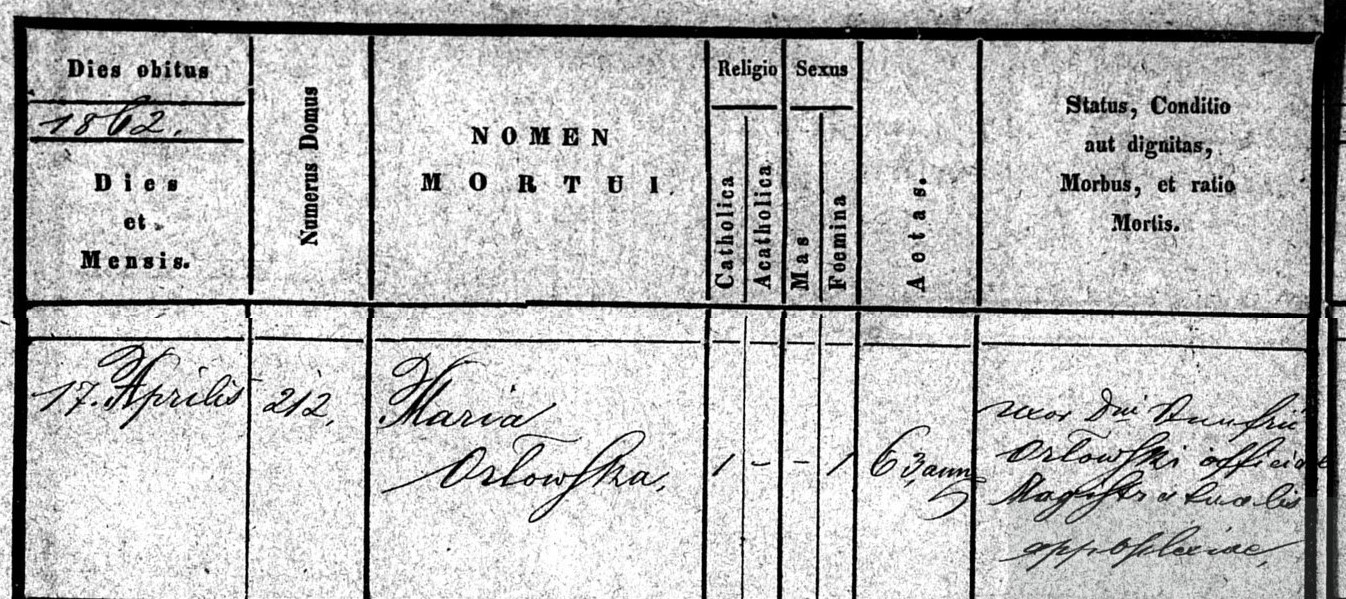 | insertonline.19179 | | | 1800 | | | ks. zgonów par. św. Anny 1862 ; zmarła w wieku 63 lata na apopleksję ; http://szukajwarchiwach.pl/29/323/0/3/Z48/skan/medium/-wWZeCQNyvqm49RylXPqjg -- Informacja p. Witolda Gogóła (z 1.4.2015) | | Uzupełnienia użytkowników wprowadzane online |