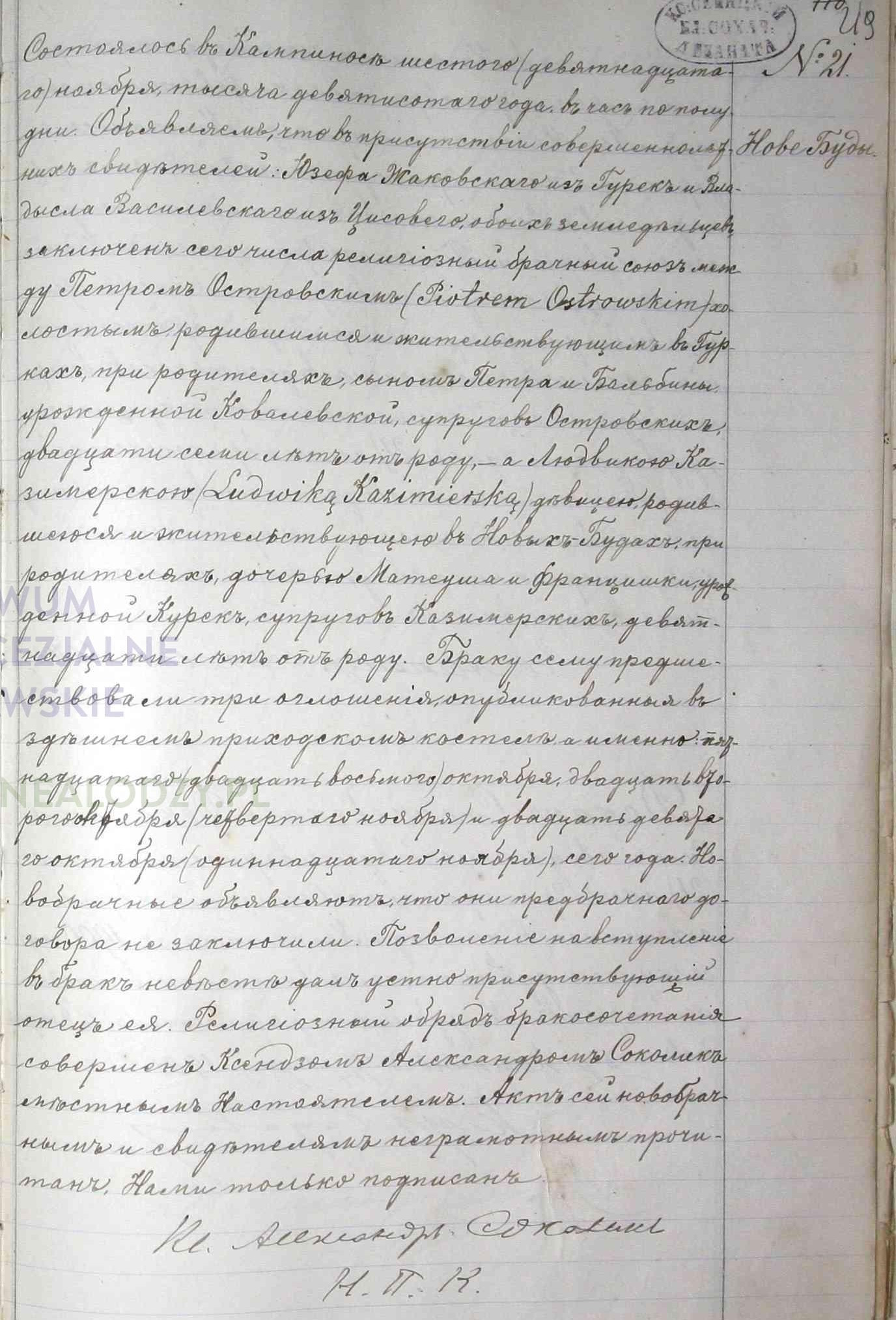 | sw.382327 | m | Piotr | | | | | Ostrowski | | | | | Akt małżeństwa: Kampinos (obecn. woj. mazow.), 21/1900 [indeks na http://geneteka.genealodzy.pl/] http://metryki.genealodzy.pl/metryki.php?op=kt&ar=2&zs=1232d&sy=4250&kt=7 [podgląd] |
