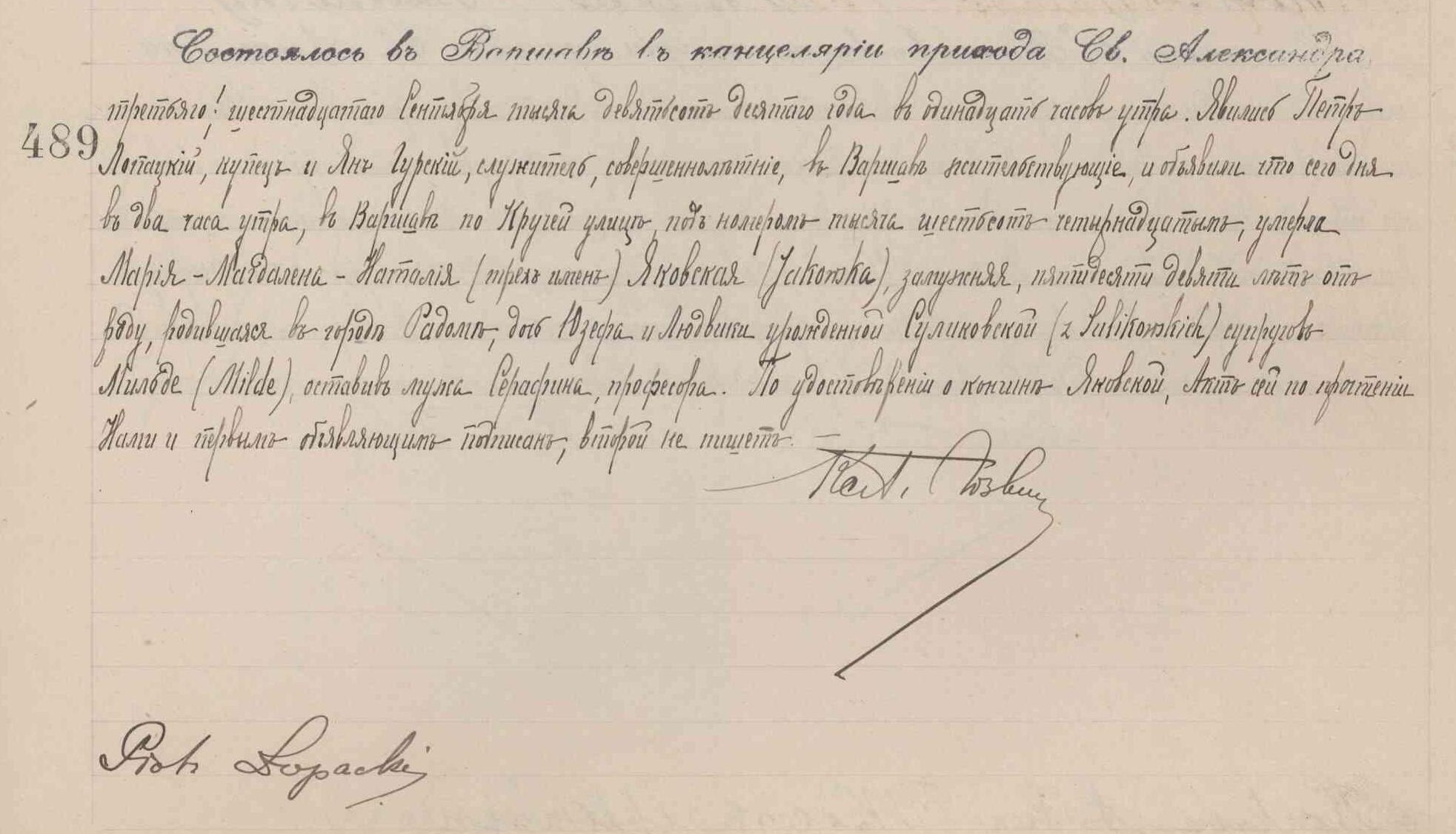 | genetekaz.11451536 | 16 | sep | 1910 | | xpar.1442 | Akt zgonu: Warszawa św. Aleksander (obecn. m. Warszawa), 489/1910 http://localhost/mjm/aleksander_1910_484-489.jpg [podglad] | | Akt zgonu obecny w bazie Geneteka |