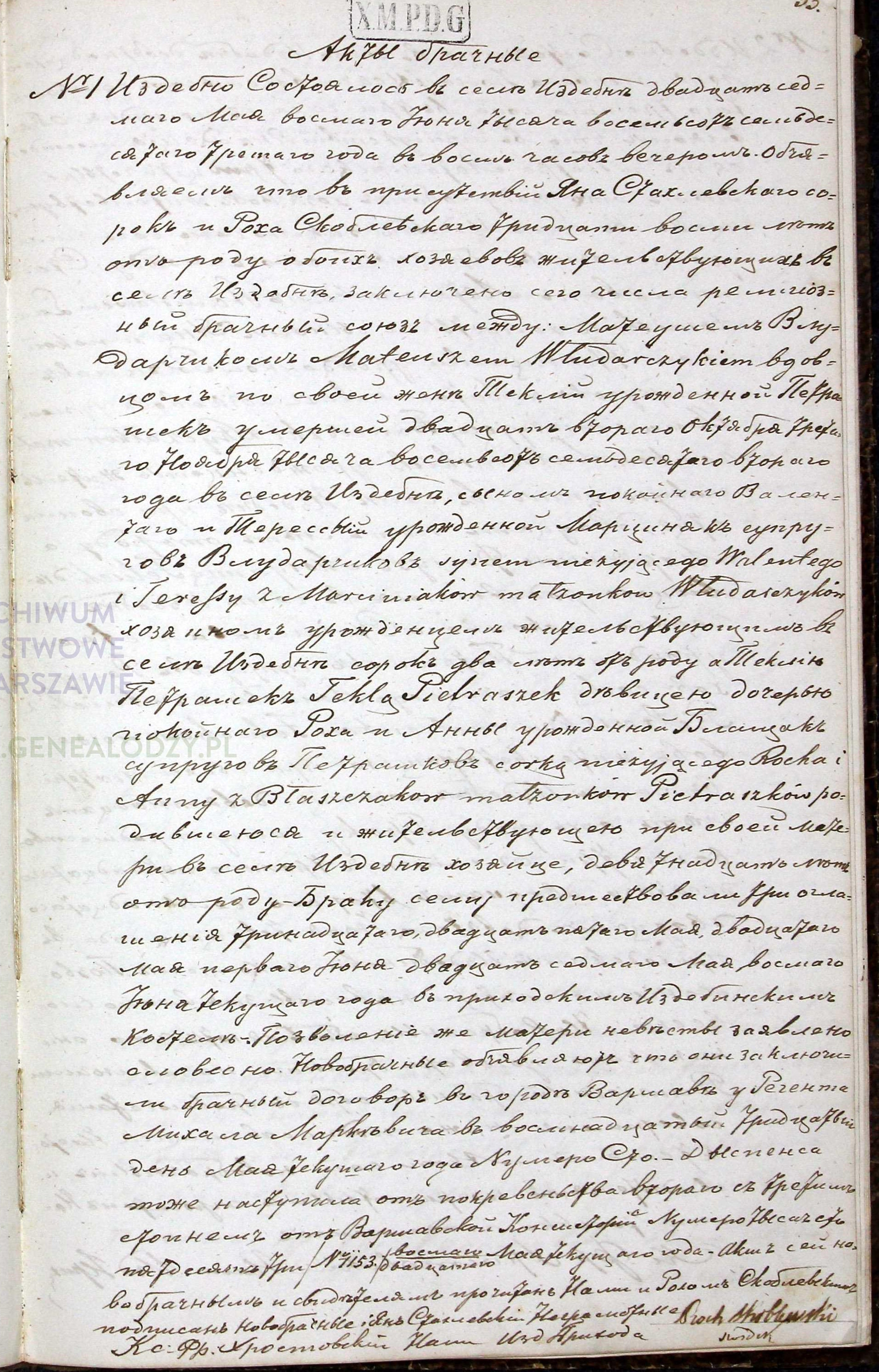 | sw.293294 | sw.251911 (sw.251911) | sw.251912 (sw.251912) | Akt małżeństwa: Izdebno Kościelne (obecn. woj. mazow.), 2/1852 [indeks na http://geneteka.genealodzy.pl/] http://metryki.genealodzy.pl/metryki.php?op=kt&ar=2&zs=0069d&sy=1852&kt=2 [podgląd] |