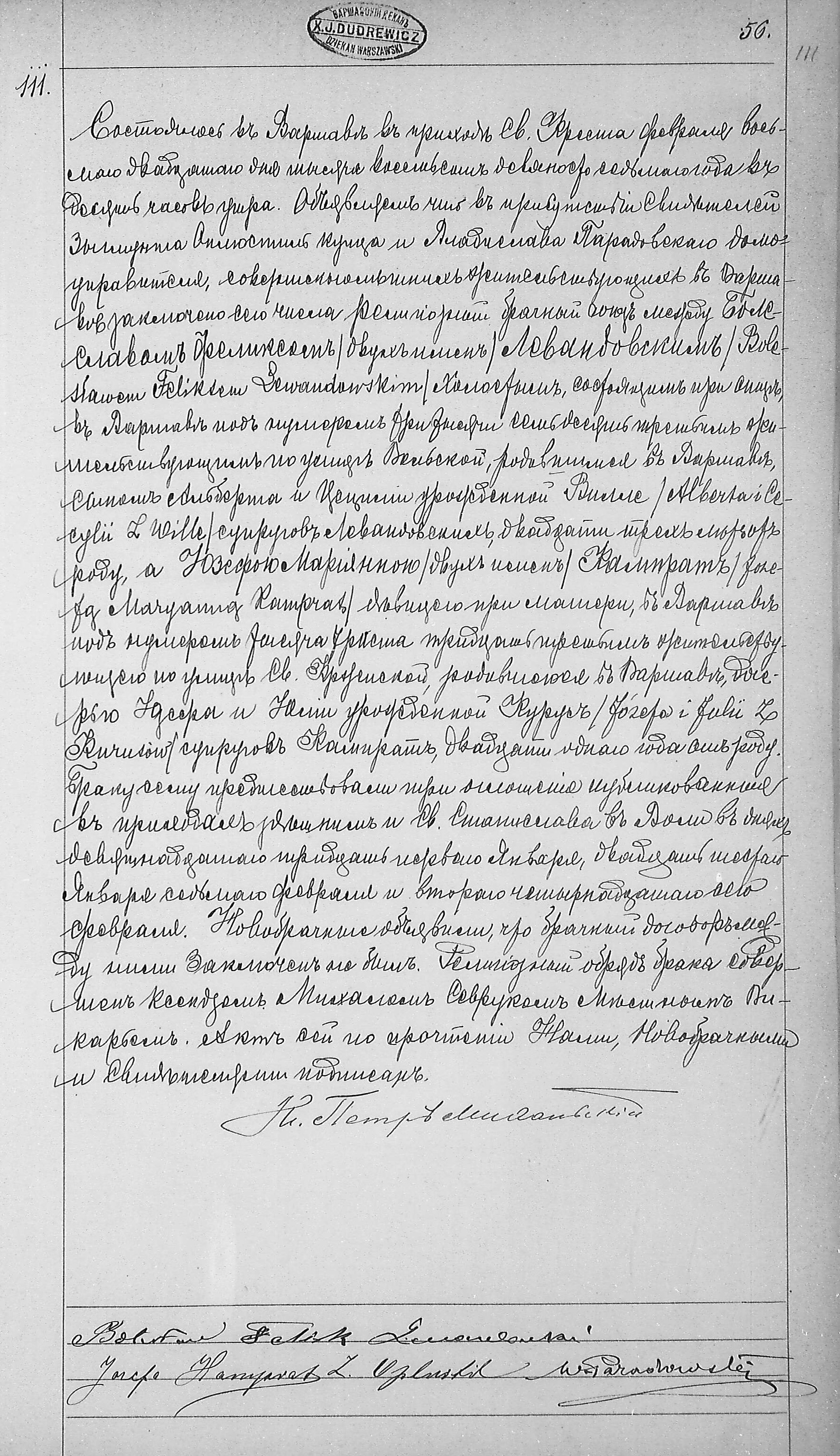 | sw.307307 | | | 1861 | | | | rodzi mu się dziecko | Akt małżeństwa: Warszawa św. Krzyż (obecn. m. Warszawa), 111/1897 [indeks na http://geneteka.genealodzy.pl/] http://metryki.genealodzy.pl/metryki.php?op=kt&ar=1&zs=0158d&sy=1897b&kt=2 [podgląd] |