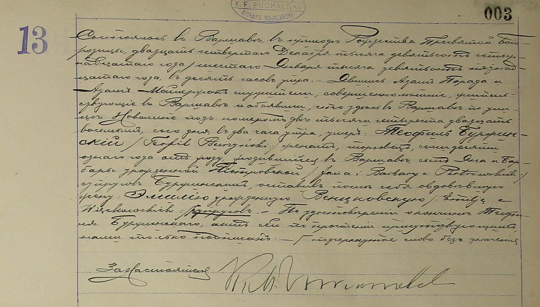 | sw.427904 | m | Teofil | | | | | Burzyński | | | | | Akt małżeństwa: Warszawa św. Jan (obecn. m. Warszawa), 177/1898 [indeks na http://geneteka.genealodzy.pl/] http://metryki.genealodzy.pl/metryka.php?ar=8&zs=9233d&sy=336&kt=3&skan=176-177.jpg [podgląd] |