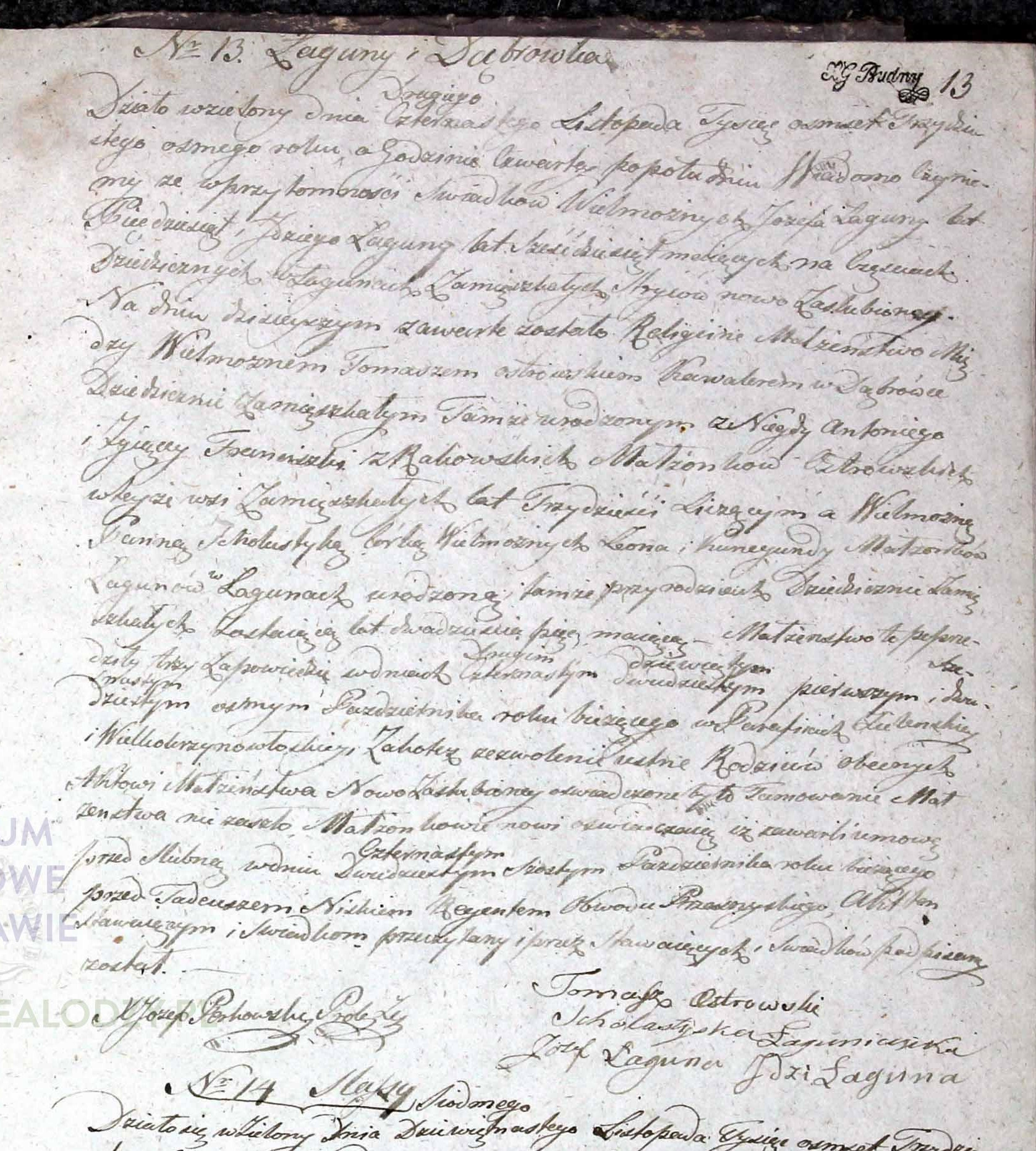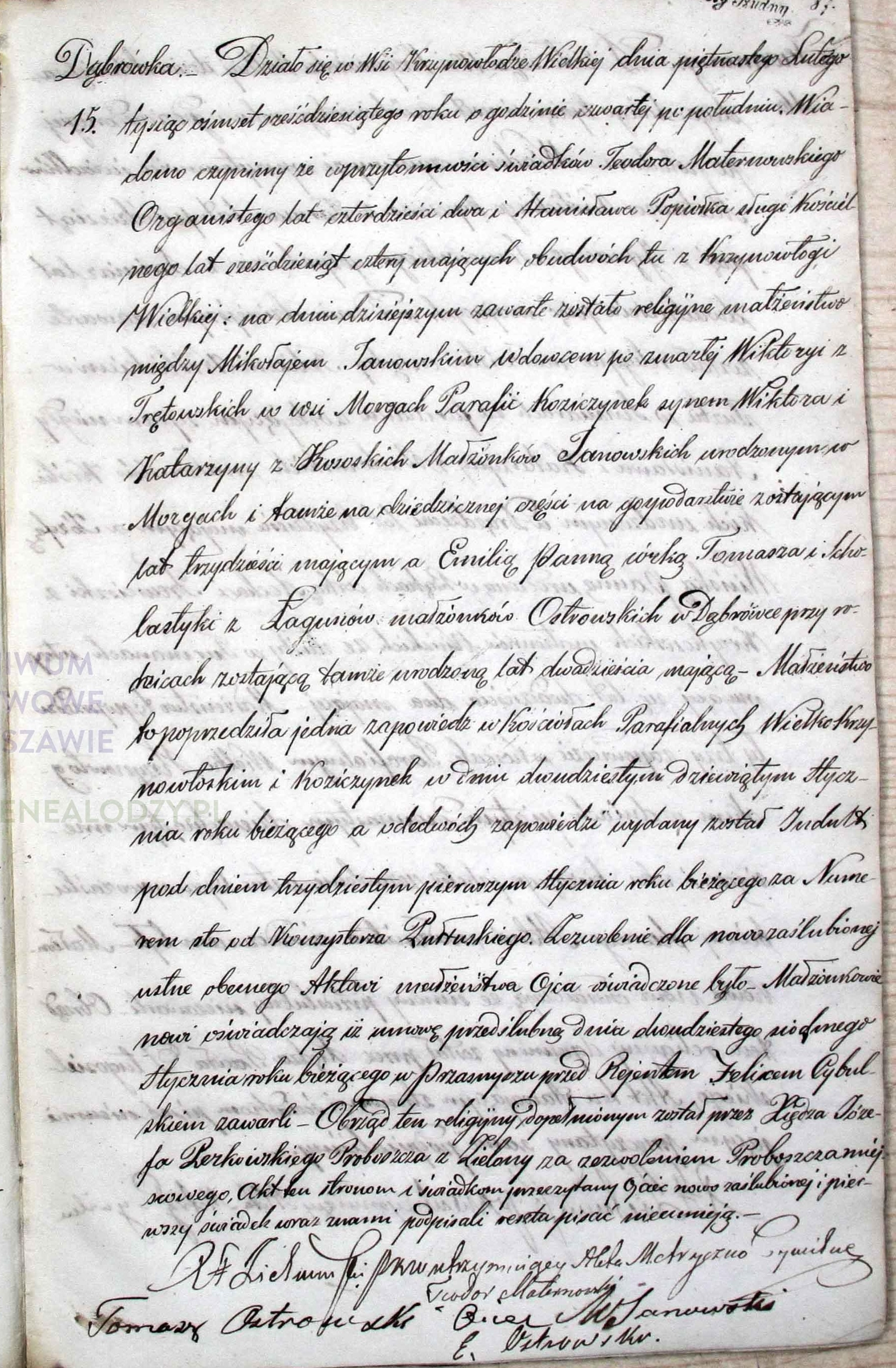 | sw.320000 | m | Tomasz | | | | | Ostrowski | | | | | Akt małżeństwa: Krzynowłoga Wielka (obecn. woj. mazow.), 25/1873 [indeks na http://geneteka.genealodzy.pl/] http://metryki.genealodzy.pl/metryka.php?ar=6&zs=0102d&sy=1873&kt=2&plik=24-25.jpg [podgląd] |