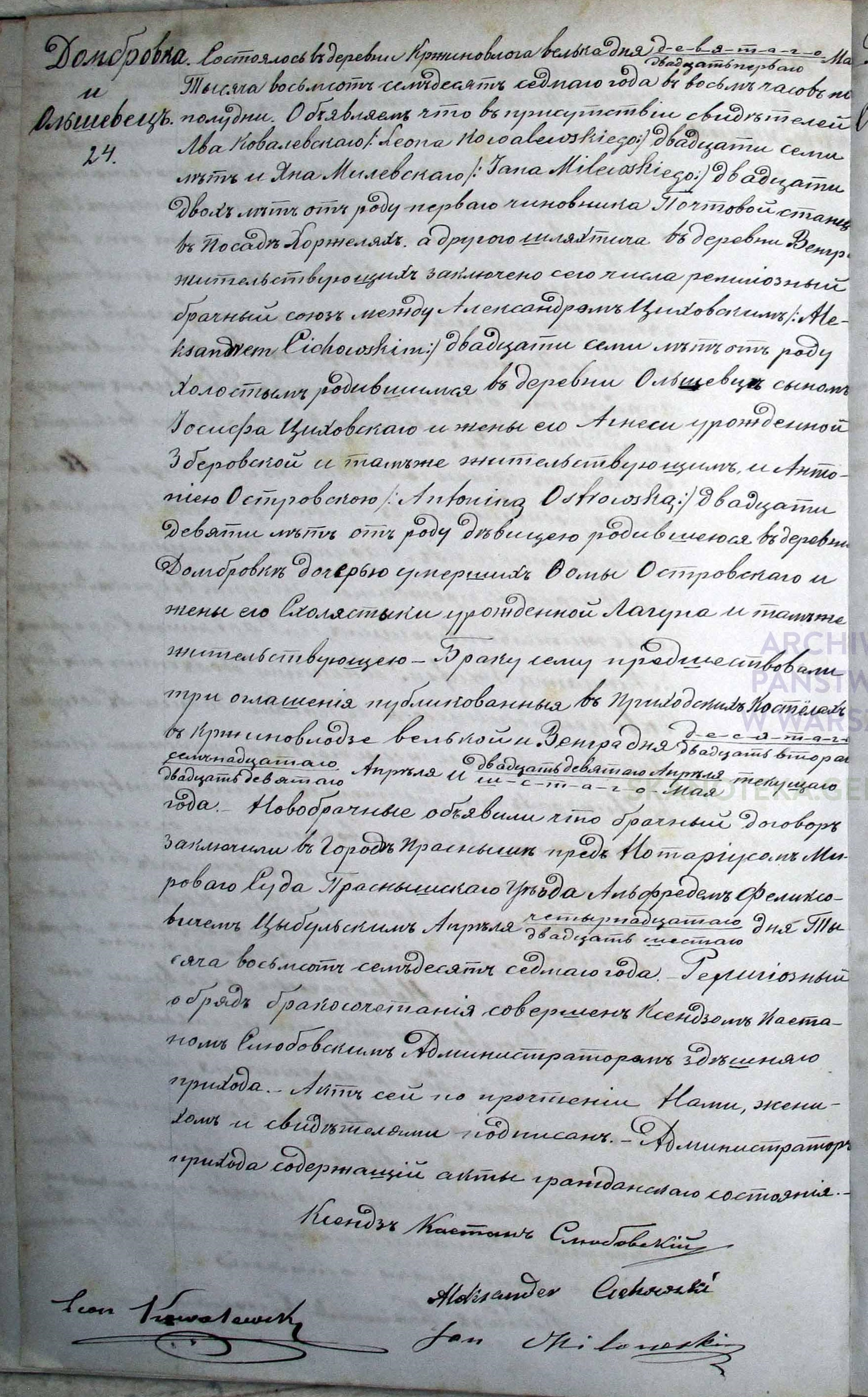 | sw.320000 | | | 1838 | | | | żeni się | Akt małżeństwa: Krzynowłoga Wielka (obecn. woj. mazow.), 25/1873 [indeks na http://geneteka.genealodzy.pl/] http://metryki.genealodzy.pl/metryka.php?ar=6&zs=0102d&sy=1873&kt=2&plik=24-25.jpg [podgląd] |