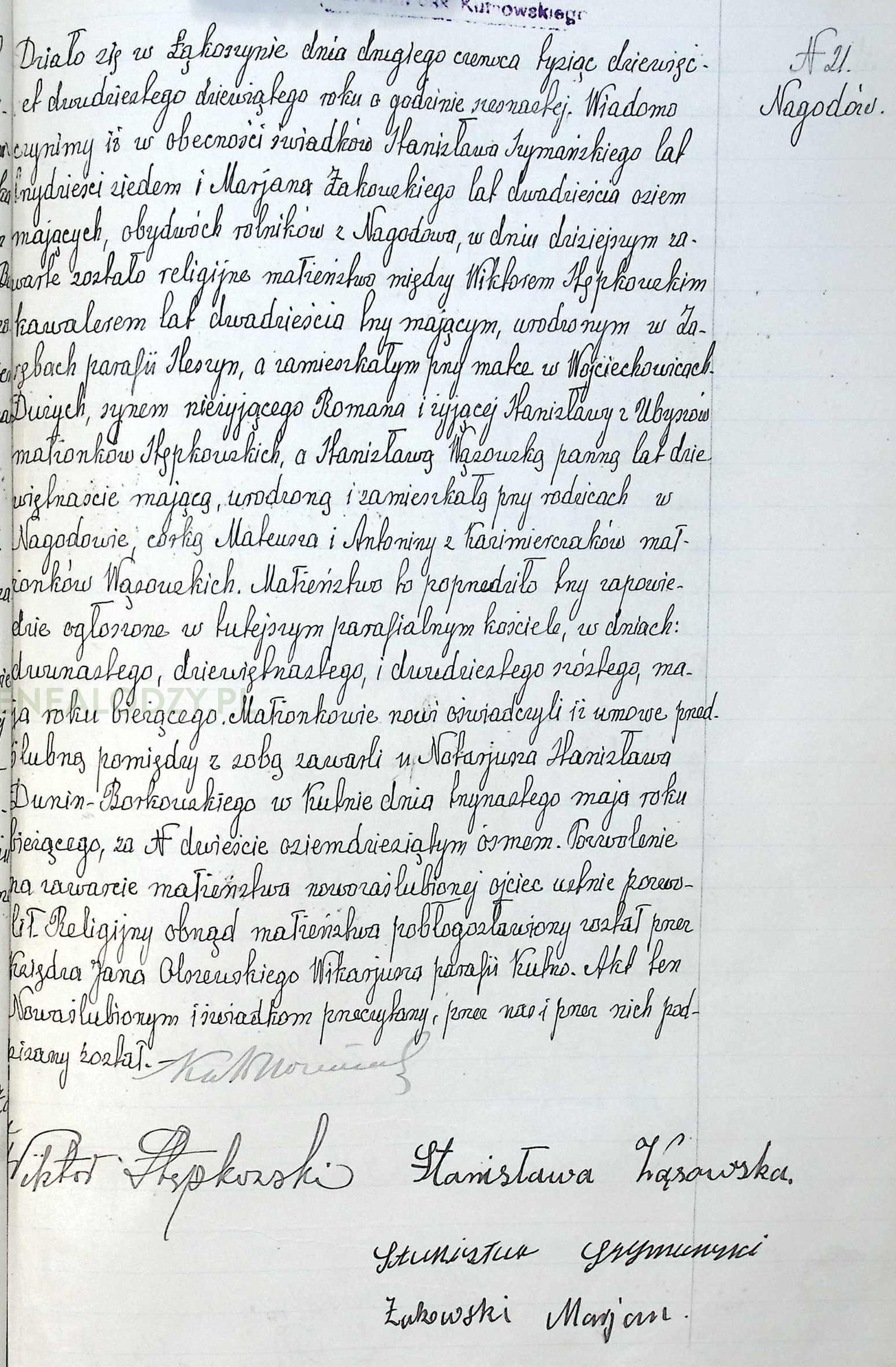 | sw.320418 | le.3909.1.18 (le.3909.1.18) | sw.268661 (sw.268661) | Akt małżeństwa: Kutno-Łąkoszyn (obecn. woj. łódz.), 7/1904 [indeks na http://geneteka.genealodzy.pl/] http://metryki.genealodzy.pl/metryka.php?ar=3&zs=1556d&sy=1904&kt=2&skan=06-07.jpg [podgląd] |