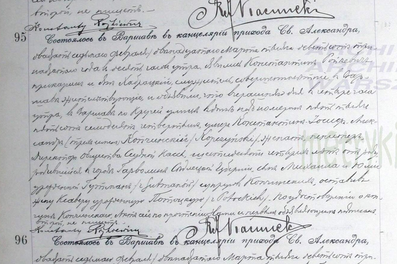 | sw.322689 | m | Konstanty | Józef | Aleksander | | | | | | | | Akt małżeństwa: Warszawa św. Aleksander (obecn. m. Warszawa), 18/1880 [indeks na http://geneteka.genealodzy.pl/] http://metryki.genealodzy.pl/metryki.php?op=kt&ar=1&zs=0162d&sy=1880&kt=2 [podgląd] |