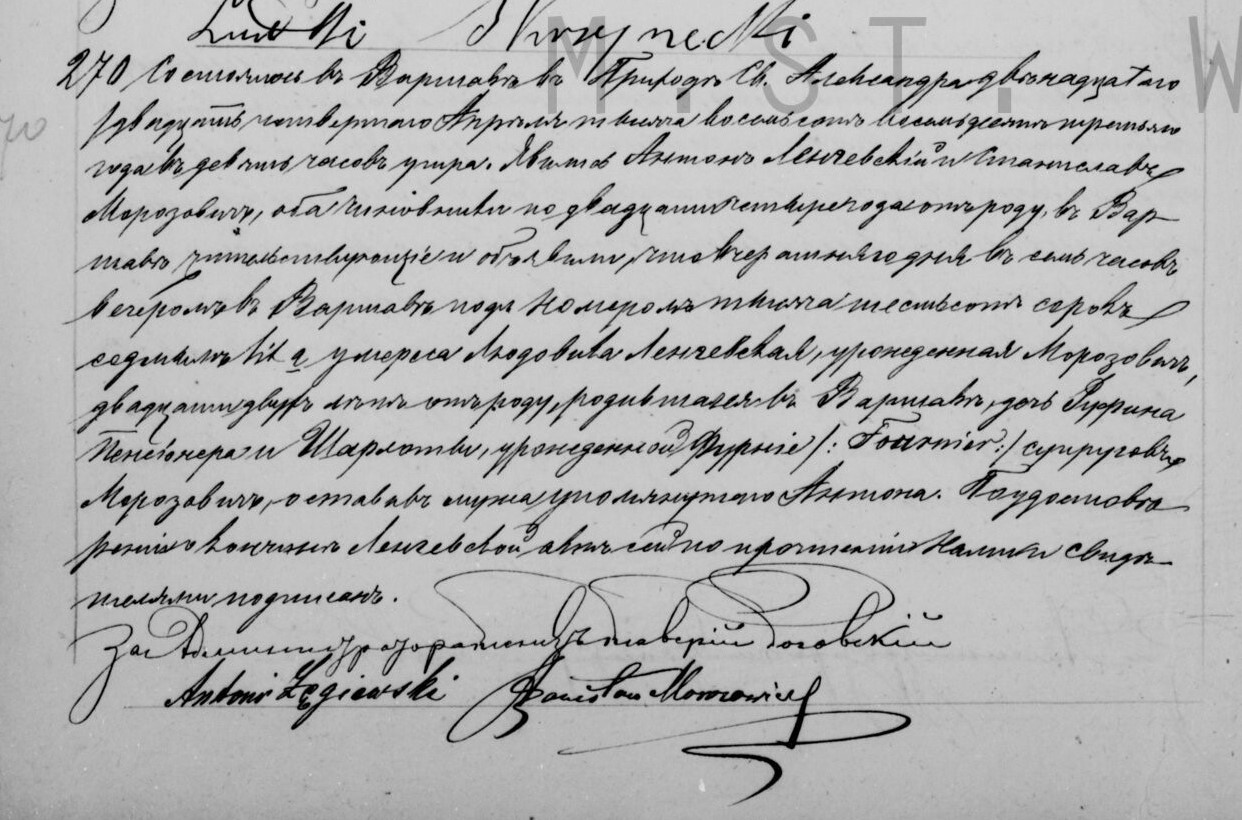 | genetekaz.11332099 | 23 | apr | 1883 | | xpar.1442 | Akt zgonu: Warszawa św. Aleksander (obecn. m. Warszawa), 270/1883 http://localhost/mjm/aleksander_1883_158_114_0464.jpg [podglad] | | Akt zgonu obecny w bazie Geneteka |