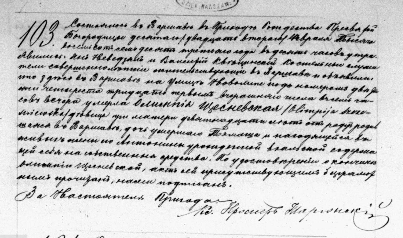 | sw.1045108 | sw.1045108 | sw.343289 (sw.343289) | sw.343290 (sw.343290) | Akt zgonu: Warszawa-Leszno Narodzenie NMP (obecn. m. Warszawa), 103/1873 [indeks na http://geneteka.genealodzy.pl/] http://localhost/mjm/leszno_1873_1217_5_0337.jpg [podgląd] |