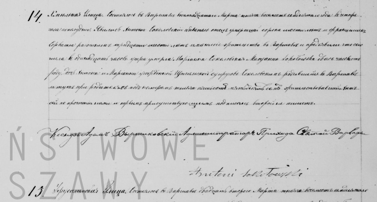 | sw.414750 | sw.414751 (sw.414751) | sw.414752 (sw.414752) | Akt małżeństwa: Warszawa św. Krzyż (obecn. m. Warszawa), 84/1864 [indeks na http://geneteka.genealodzy.pl/] http://metryki.genealodzy.pl/metryki.php?op=kt&ar=1&zs=0158d&sy=1864b&kt=2 [podgląd] |