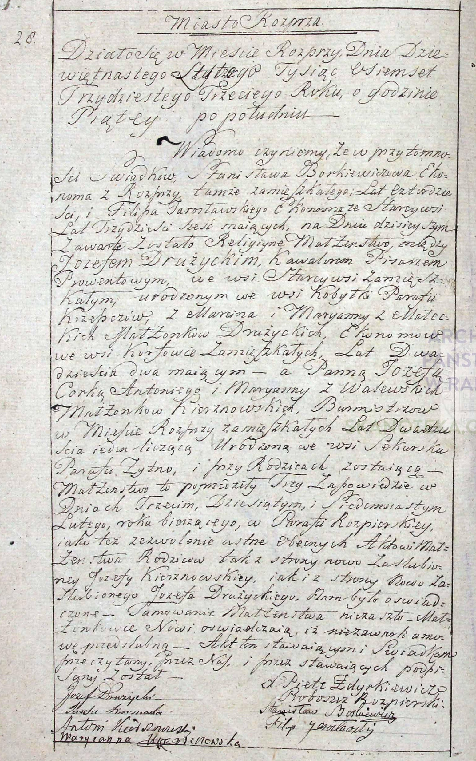 | sw.451468 | sw.485833 | sw.363645 (sw.363645) | sw.363646 (sw.363646) | Akt małżeństwa: Rozprza (obecn. woj. łódz.), 28/1833 [indeks na http://geneteka.genealodzy.pl/] http://metryki.genealodzy.pl/metryka.php?ar=3&zs=1649d&sy=1833&kt=2&skan=28-29.jpg [podgląd] |