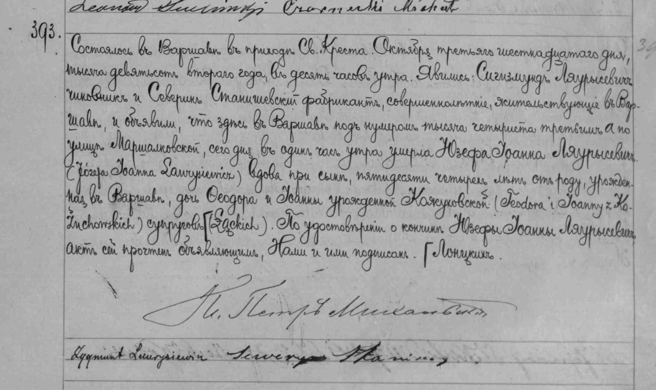 | genetekaz.11248653 | 16 | oct | 1902 | | xpar.1450 | Akt zgonu: Warszawa św. Krzyż (obecn. m. Warszawa), 393/1902 http://metryki.genealodzy.pl/metryki.php?op=kt&ar=1&zs=0158d&sy=1902&kt=3 [podglad] | | Akt zgonu obecny w bazie Geneteka |