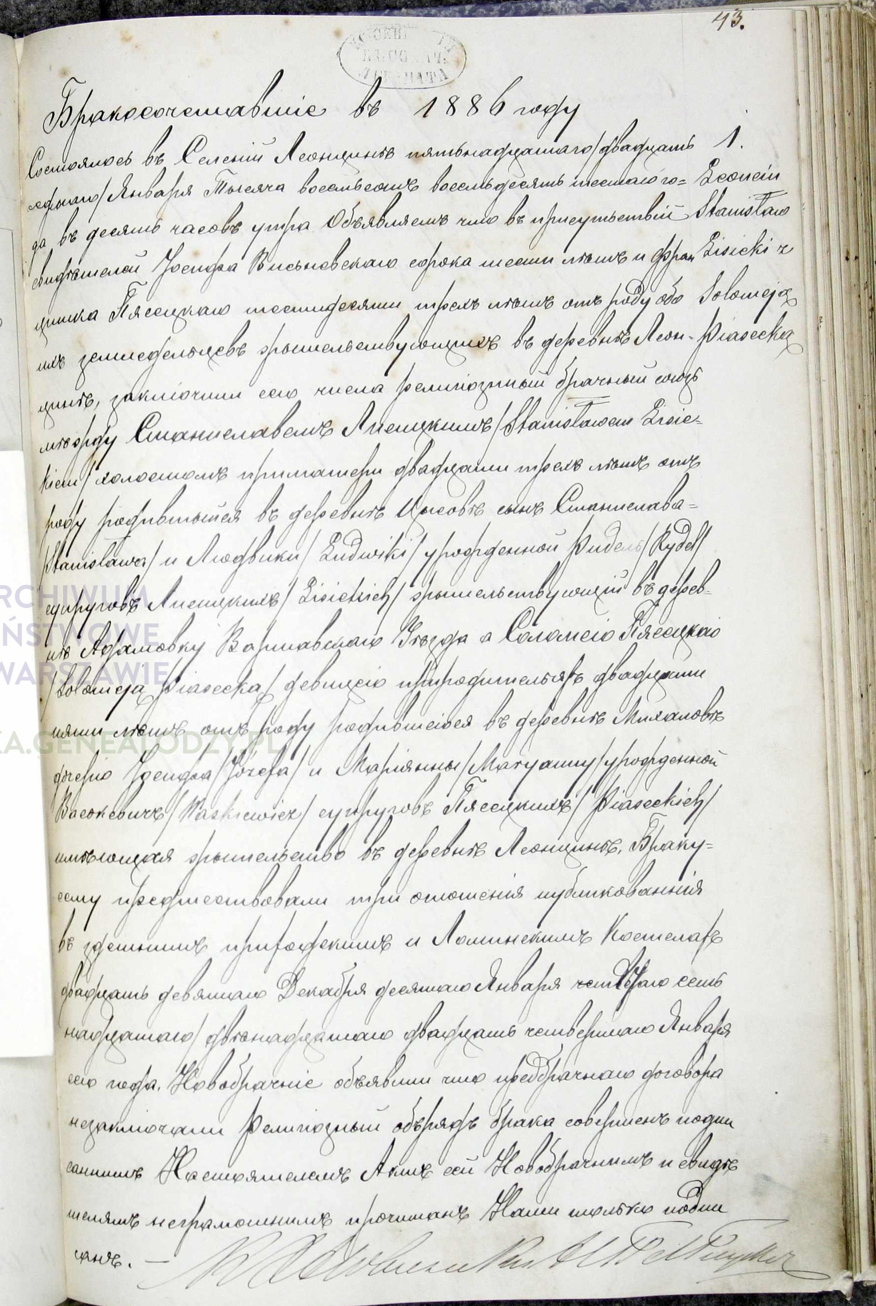 | sw.392255 | sw.440304 | sw.293855 (sw.293855) | sw.380943 (sw.380943) | Akt małżeństwa: Leoncin (obecn. woj. mazow.), 1/1886 [indeks na http://geneteka.genealodzy.pl/] http://metryki.genealodzy.pl/metryka.php?ar=2&zs=0861d&sy=120&kt=4&skan=01.jpg [podgląd] |