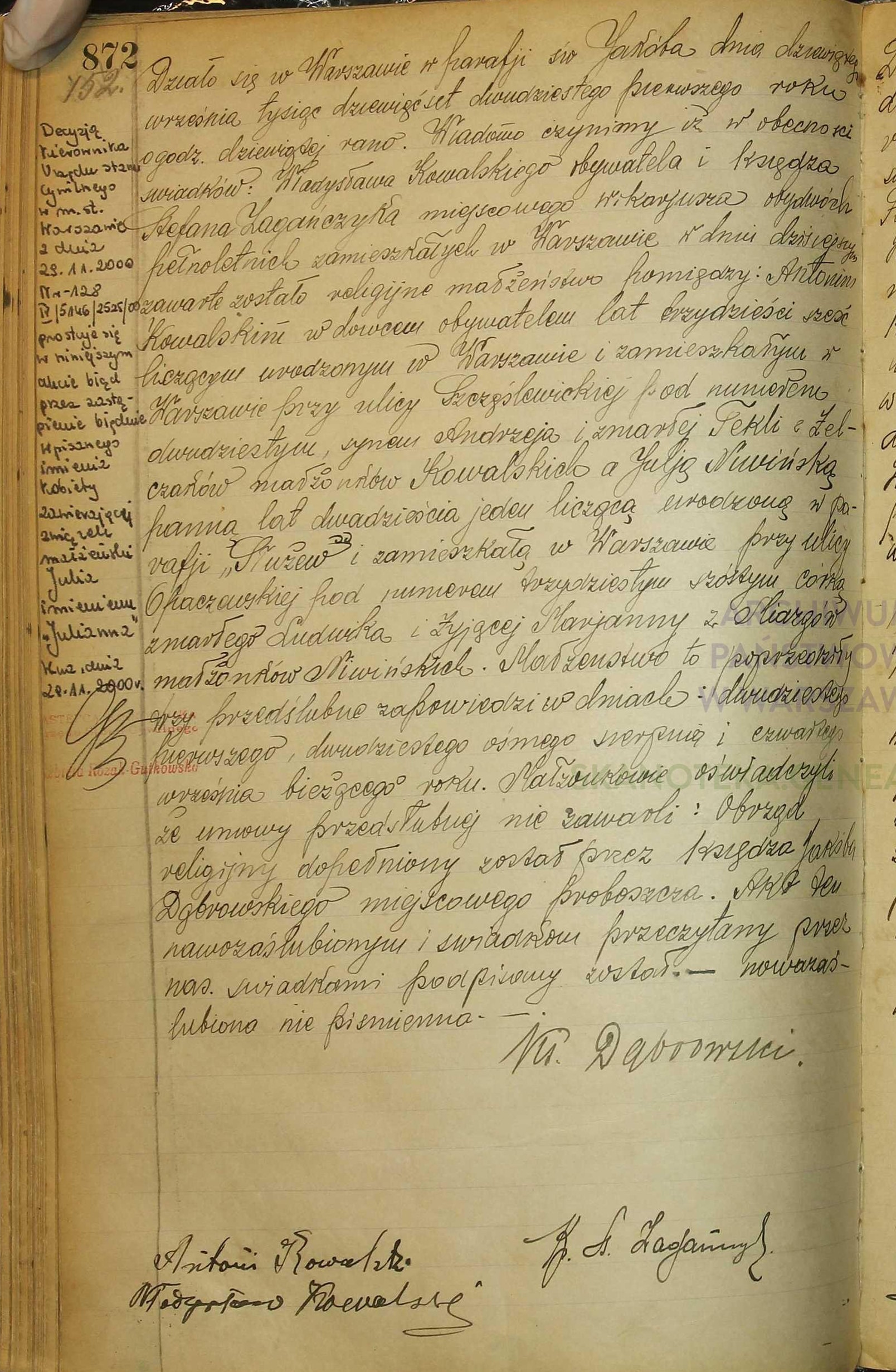 | sw.992492 | sw.992492 | sw.391896 (sw.391896) | sw.841539 (sw.841539) | Akt małżeństwa: Warszawa-Służew św. Katarzyna (obecn. m. Warszawa), 51/1913 [indeks na http://geneteka.genealodzy.pl/] http://metryki.genealodzy.pl/metryki.php?op=kt&ar=1&zs=0175d&sy=1913&kt=2 [podgląd] |