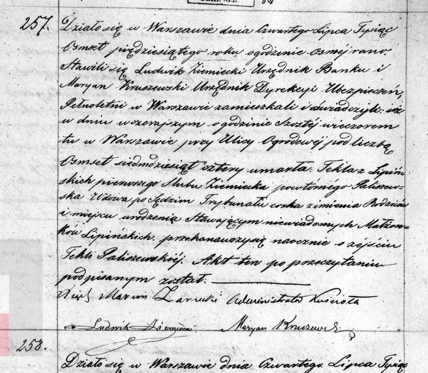 | genetekaz.3468928 | 3 | jul | 1850 | xpar.1443 | Akt zgonu: Warszawa św. Andrzej (obecn. m. Warszawa), 257/1850 http://szukajwarchiwach.pl/72/159/0/-/20/skan/full/EOzhcdemXUojgReI0ZQ_qw [podglad] | Akt zgonu obecny w bazie Geneteka | ||