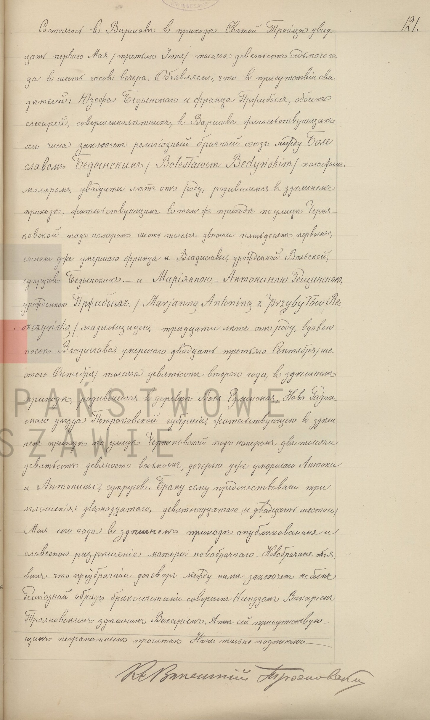 | sw.989772 | sw.989772 | sw.405755 (sw.405755) | sw.405758 (sw.405758) | Akt małżeństwa: Warszawa św. Trójca (obecn. m. Warszawa), 121/1907 [indeks na http://geneteka.genealodzy.pl/] http://metryki.genealodzy.pl/metryki.php?op=kt&ar=1&zs=1215d&sy=1907b&kt=2 [podgląd] |