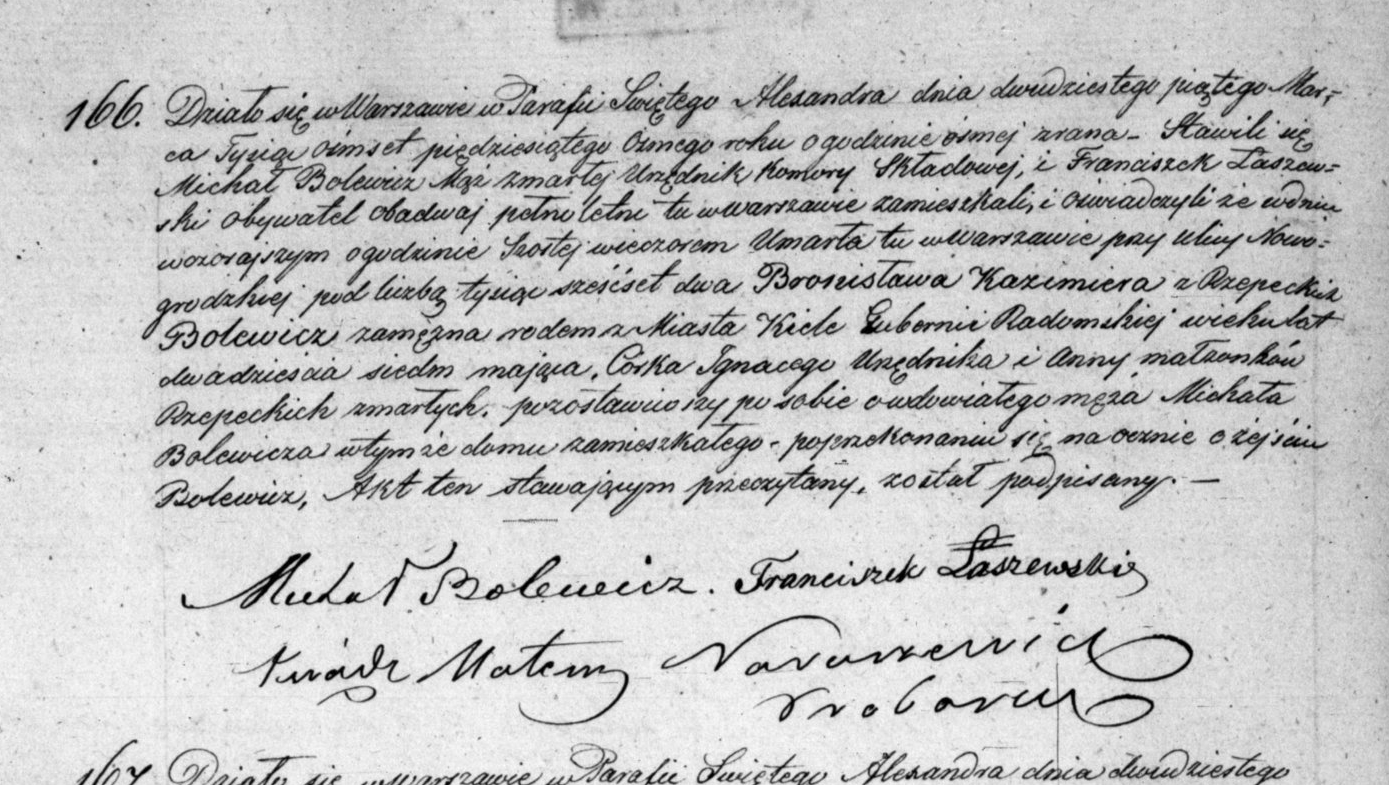 | genetekaz.3396115 | 24 | mar | 1858 | | xpar.1442 | Akt zgonu: Warszawa św. Aleksander (obecn. m. Warszawa), 166/1858 http://szukajwarchiwach.pl/72/162/0/-/36/skan/full/xUqEOwf7juYPrtMvHaX6cw [podglad] | | Akt zgonu obecny w bazie Geneteka |