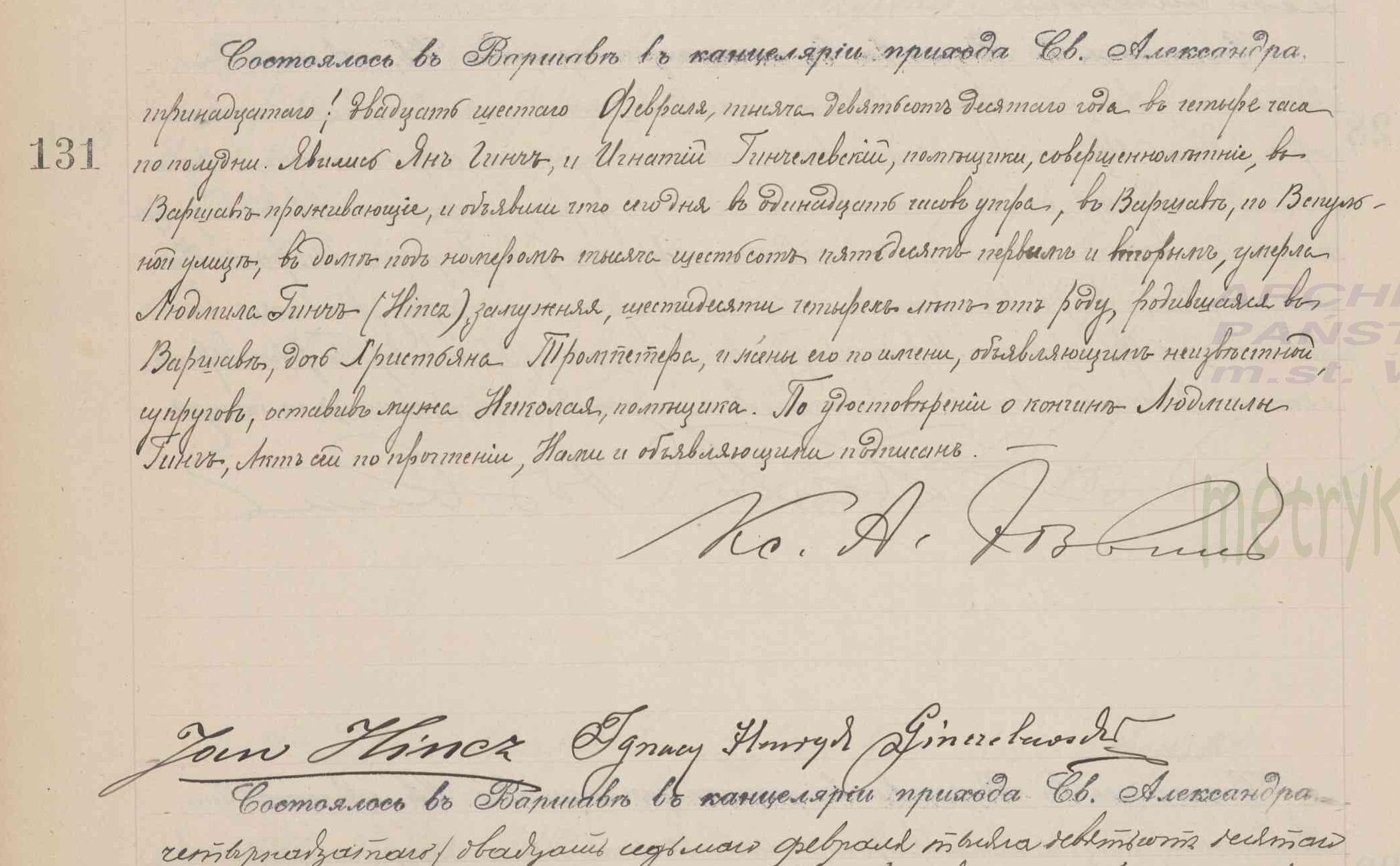 | genetekaz.11451178 | 26 | feb | 1910 | | xpar.1442 | Akt zgonu: Warszawa św. Aleksander (obecn. m. Warszawa), 131/1910 http://localhost/mjm/aleksander_1910_130-135.jpg [podglad] | | Akt zgonu obecny w bazie Geneteka |