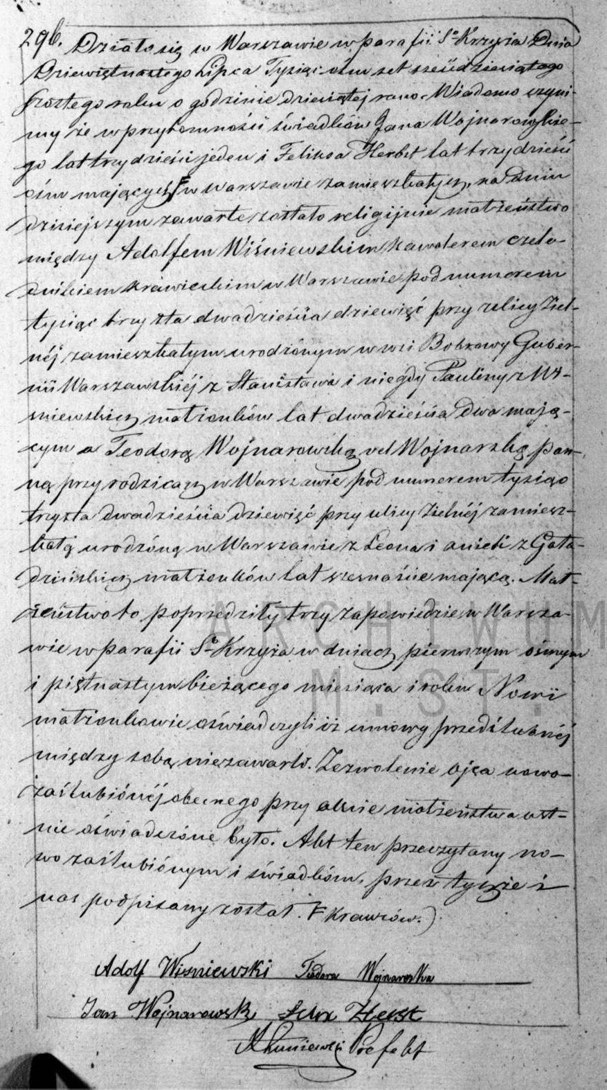 | sw.424674 | sw.425278 | sw.425279 (sw.425279) | sw.425280 (sw.425280) | Akt małżeństwa: Warszawa św. Krzyż (obecn. m. Warszawa), I-296/1866 [indeks na http://geneteka.genealodzy.pl/] http://metryki.genealodzy.pl/metryki.php?op=kt&ar=1&zs=0158d&sy=1866b&kt=2 [podgląd] |