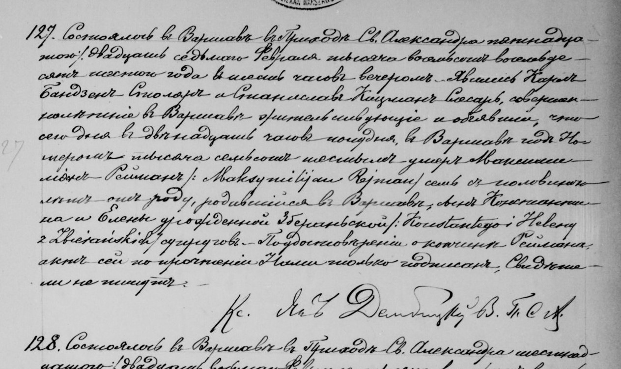 | sw.427627 | | | 1881 | | | | rodzi mu się dziecko | Akt małżeństwa: Warszawa św. Jan (obecn. m. Warszawa), 39/1868 [indeks na http://geneteka.genealodzy.pl/] http://metryki.genealodzy.pl/metryki.php?op=kt&ar=8&zs=9233d&sy=328&kt=3 [podgląd] |