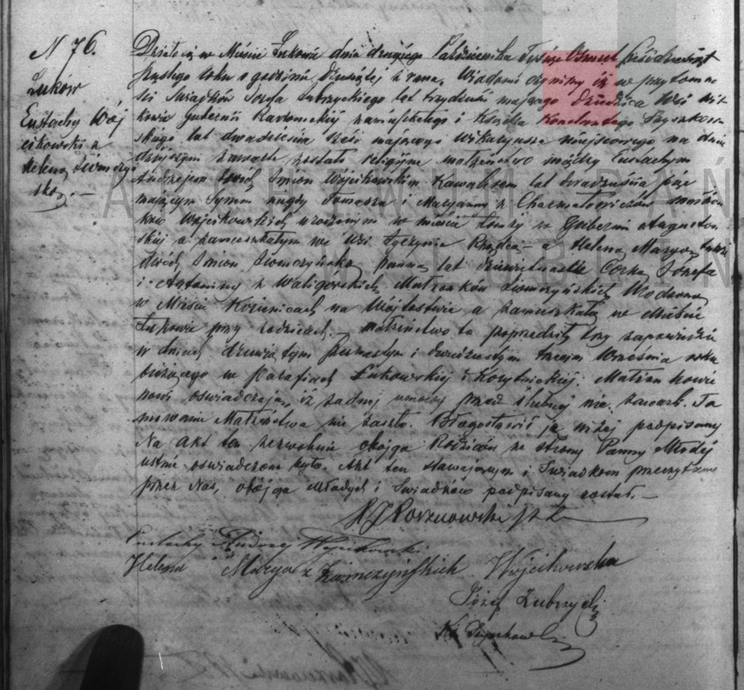 | sw.430274 | sw.430275 (sw.430275) | 1866 | xpar.185 | Akt małżeństwa: Łuków (obecn. woj. lubel.), rok 1866, nr aktu 76 [indeks na http://lubgens.eu/] https://szukajwarchiwach.pl/35/1872/0/2.4/86/skan/full/7kqsnGWPI7GpUzjQISuB1Q [podgląd] | Akt ślubu obecny w bazie Lubgens |