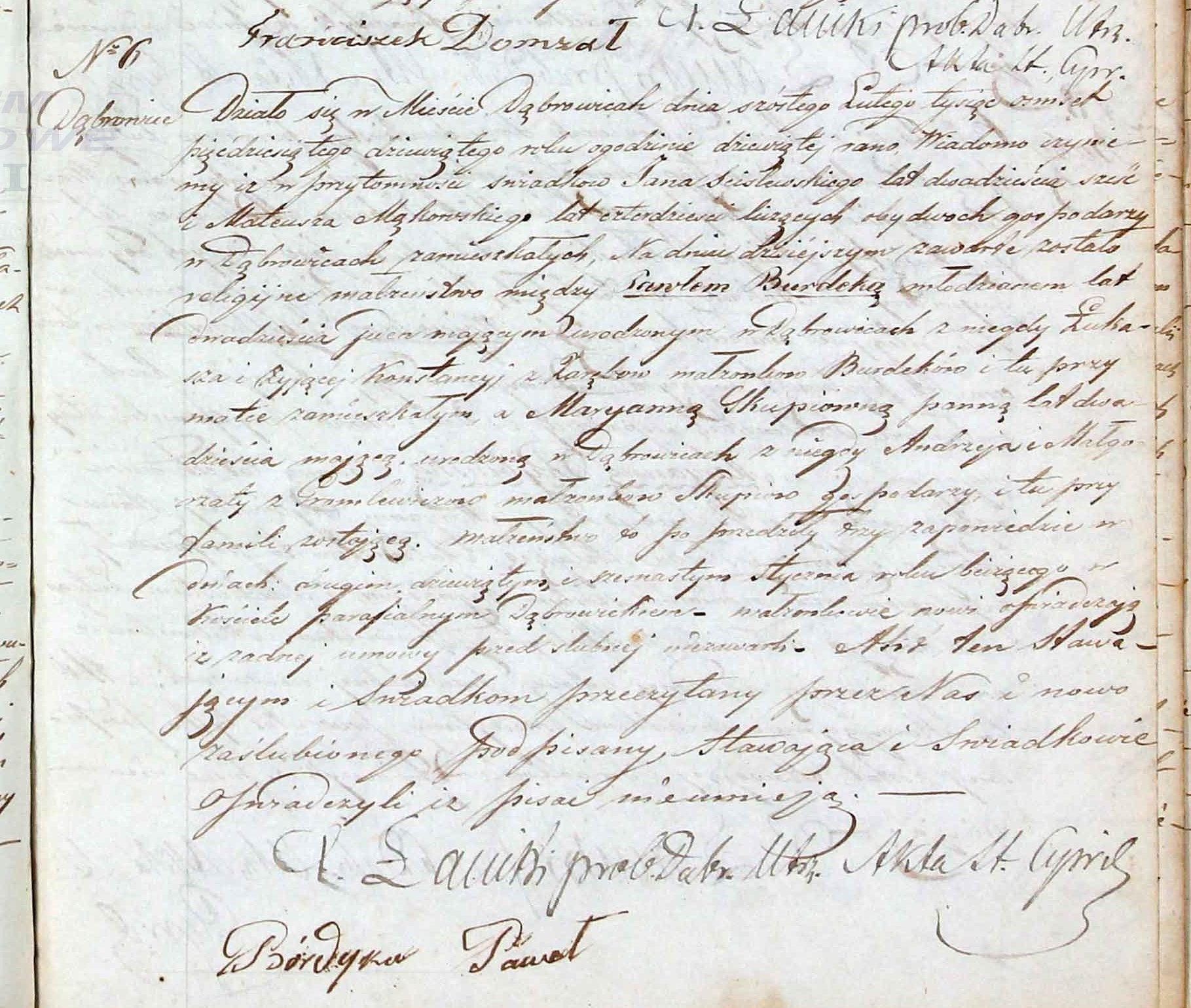 | sw.458690 | sw.451345 (sw.451345) | sw.451346 (sw.451346) | Akt małżeństwa: Dąbrowice (obecn. woj. łódz.), 16/1834 [indeks na http://geneteka.genealodzy.pl/] http://metryki.genealodzy.pl/metryki.php?op=kt&ar=3&zs=1453d&sy=1834&kt=2 [podgląd] |