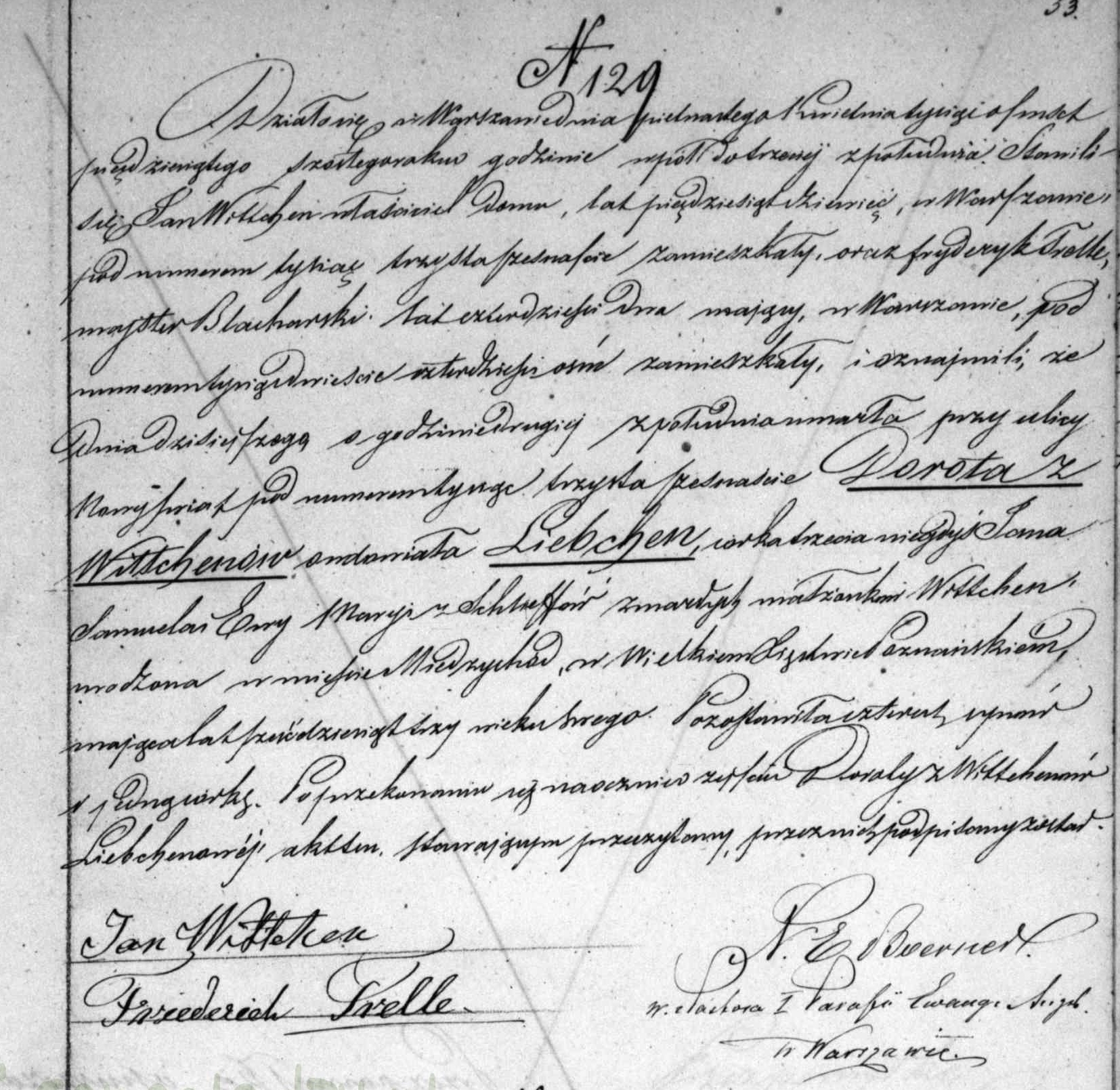 | sw.499625 | m | Jan | Samuel | | | | Wittchen | | | | | Akt małżeństwa: Warszawa ASC Cyrkuł III (obecn. m. Warszawa), 32/1812 [indeks na http://geneteka.genealodzy.pl/] http://metryki.genealodzy.pl/metryka.php?ar=1&zs=0185d&sy=104&kt=2&skan=032.jpg [podgląd] |