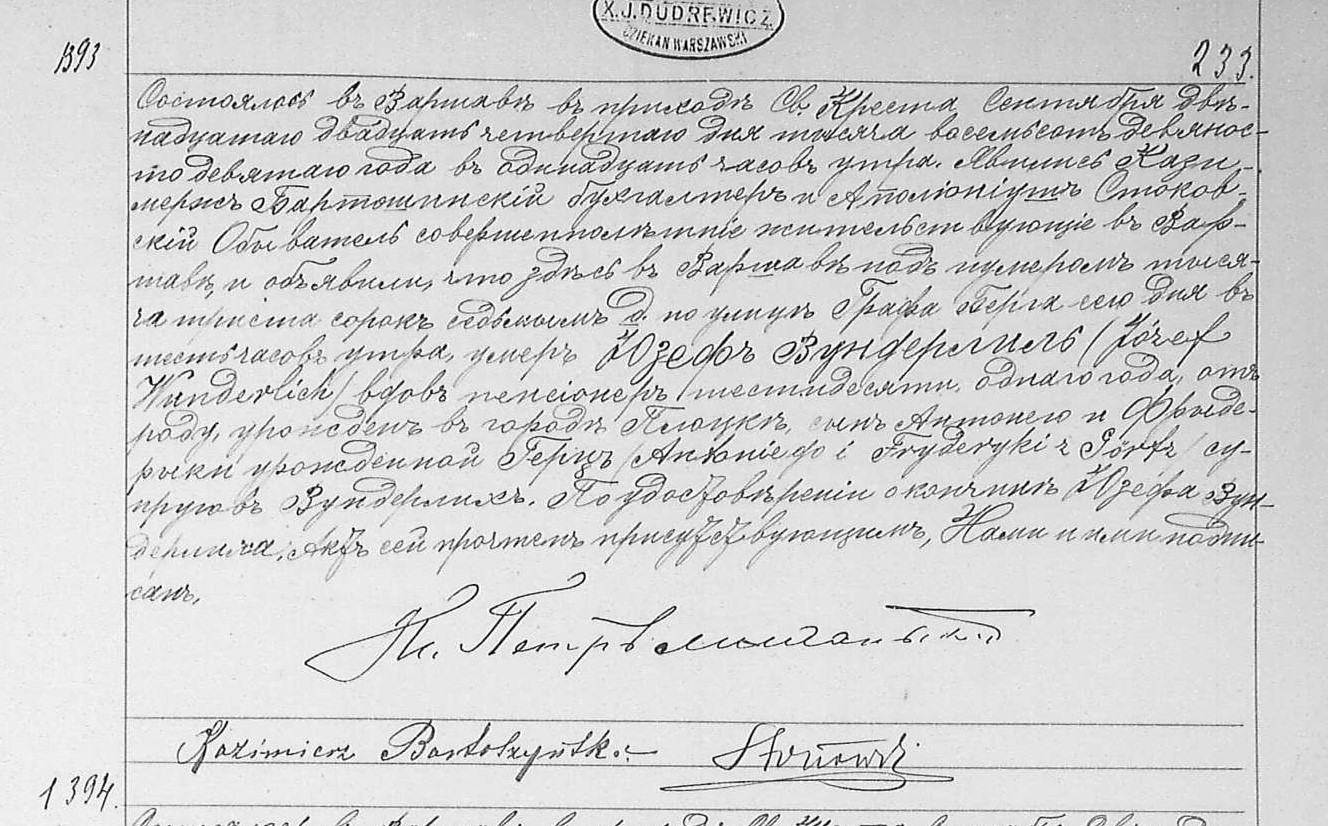 | sw.509527 | m | Antoni | | | | | Wunderlich | | | | | Akt małżeństwa: Ciachcin (obecn. woj. mazow.), 6/1876 [indeks na http://geneteka.genealodzy.pl/] |