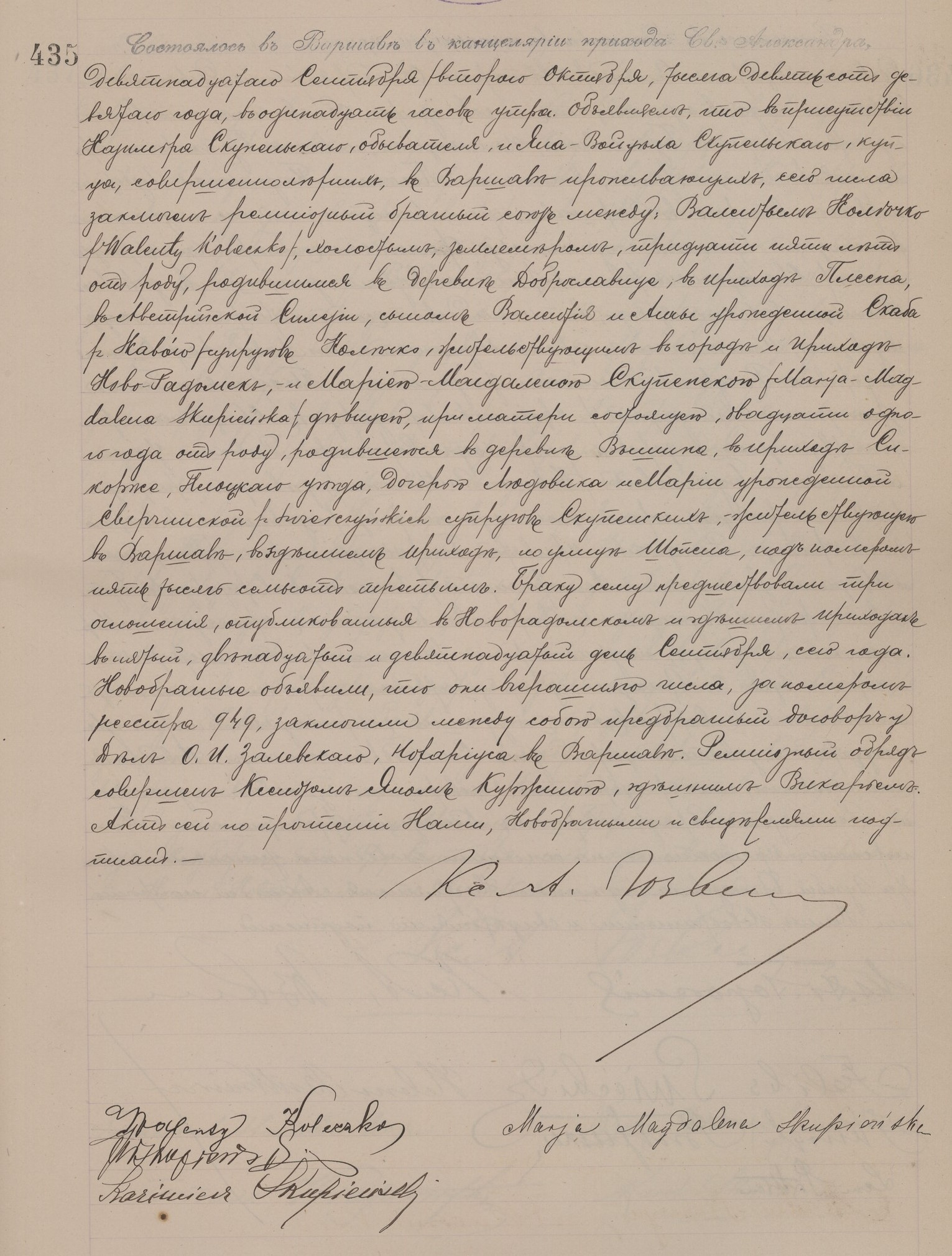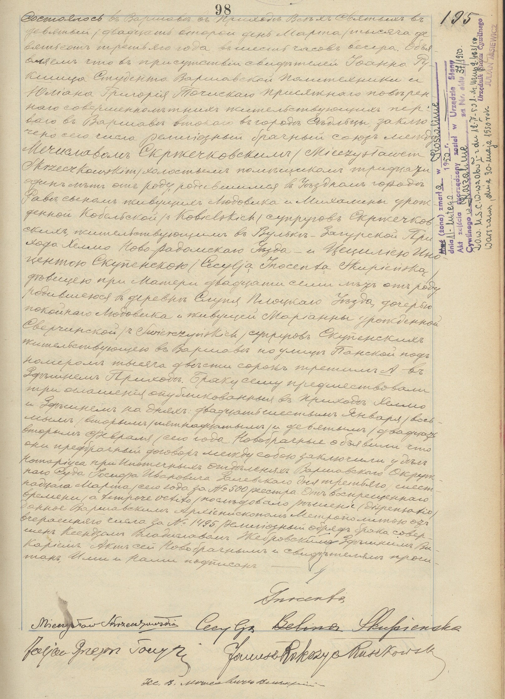 | sw.733999 | sw.1102128 | sw.1102129 (sw.509530) | sw.1102130 (sw.509533) | Akt małżeństwa: Warszawa św. Aleksander (obecn. m. Warszawa), 435/1909 [indeks na http://geneteka.genealodzy.pl/] http://metryki.genealodzy.pl/metryka.php?ar=8&zs=9214d&sy=325&kt=1&skan=435.jpg [podgląd] |