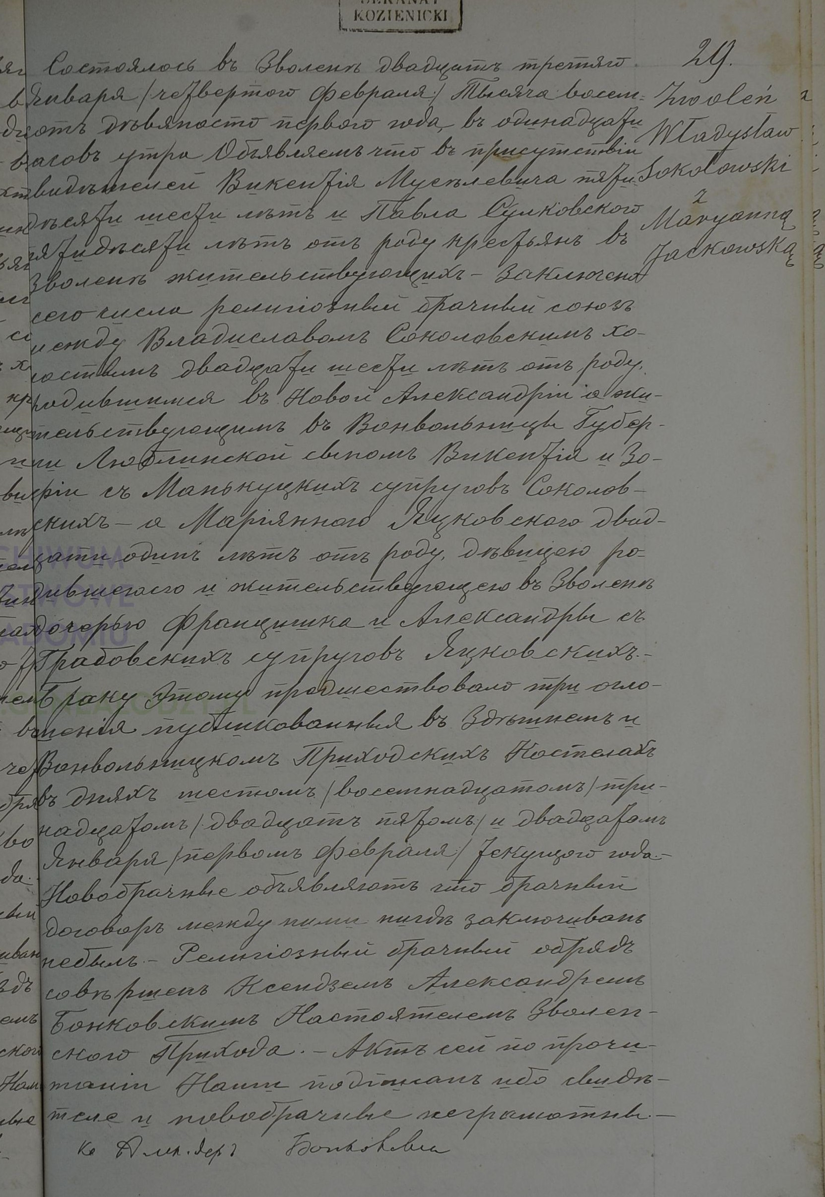 | sw.527406 | m | Wincenty | | | | | Sokołowski | | | | | Akt małżeństwa: Wąwolnica (obecn. woj. lubel.), 48/1883 [indeks na http://lubgens.eu/] https://szukajwarchiwach.pl/35/1950/0/2.4/100/skan/full/CT-QCIkfKNwWoPOzEBa5uw [podgląd] |