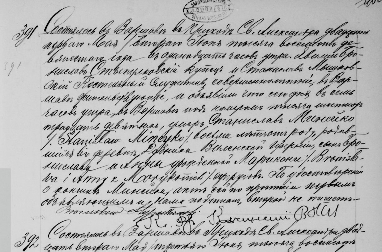 | genetekaz.3219778 | | | 1890 | | xpar.1442 | Akt zgonu: W-wa św. Aleksander (obecn. m. Warszawa), 391/1890 http://szukajwarchiwach.pl/72/162/0/-/114/str/1/16/100#tabSkany [podglad] | | Akt zgonu obecny w bazie Geneteka |