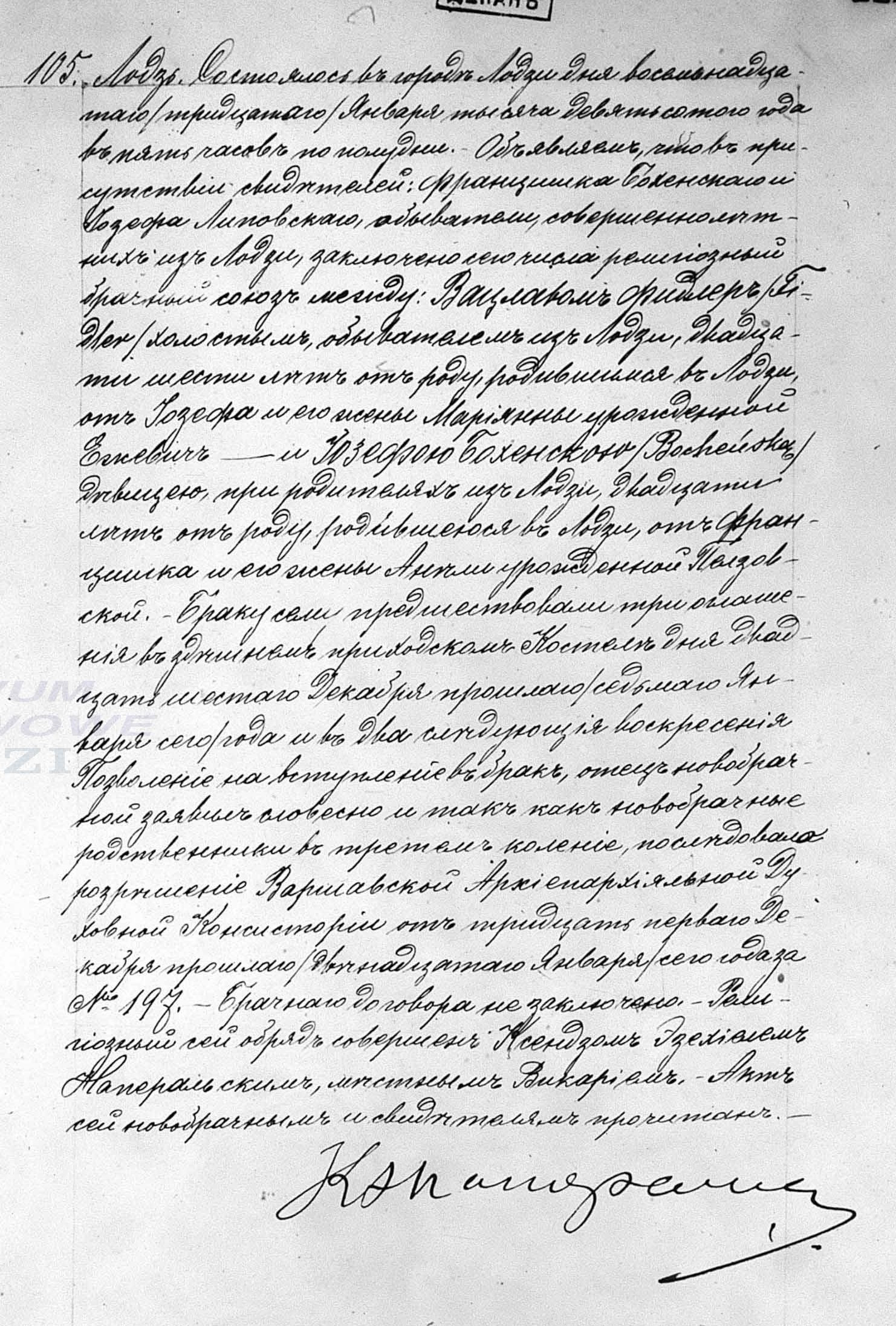 | sw.1165237 | sw.1165237 | sw.591895 (sw.591895) | sw.591898 (sw.591898) | Akt małżeństwa: Łódź NMP (obecn. woj. łódz.), 105/1900 [indeks na http://geneteka.genealodzy.pl/] http://metryki.genealodzy.pl/metryki.php?op=kt&ar=3&zs=1562d&sy=1900&kt=3 [podgląd] |
