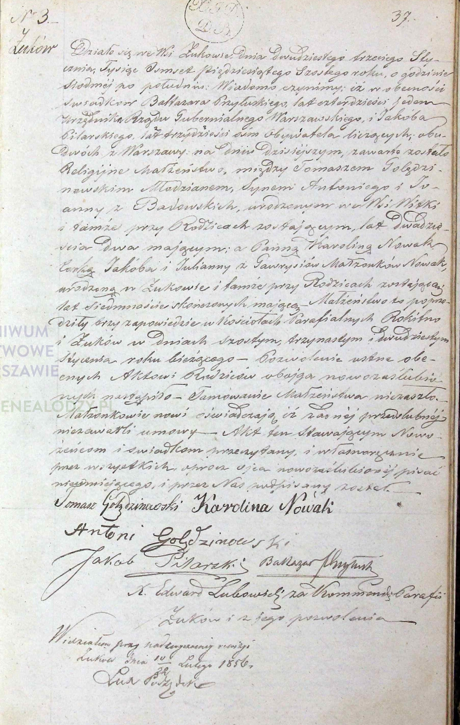 | sw.595346 | | | 1838 | | | | rodzi mu się dziecko | Akt małżeństwa: Żuków (obecn. woj. mazow.), 3/1856 [indeks na http://geneteka.genealodzy.pl/] http://metryki.genealodzy.pl/metryki.php?op=kt&ar=2&zs=0083d&sy=1856&kt=2 [podgląd] |