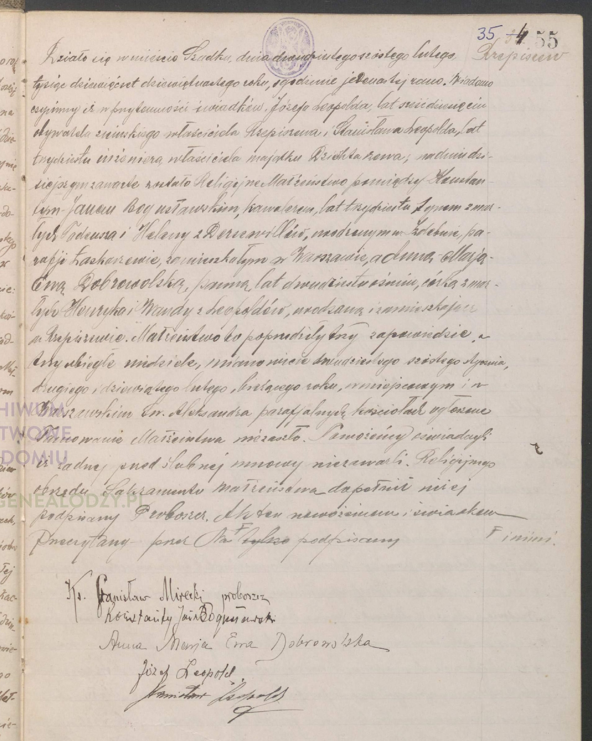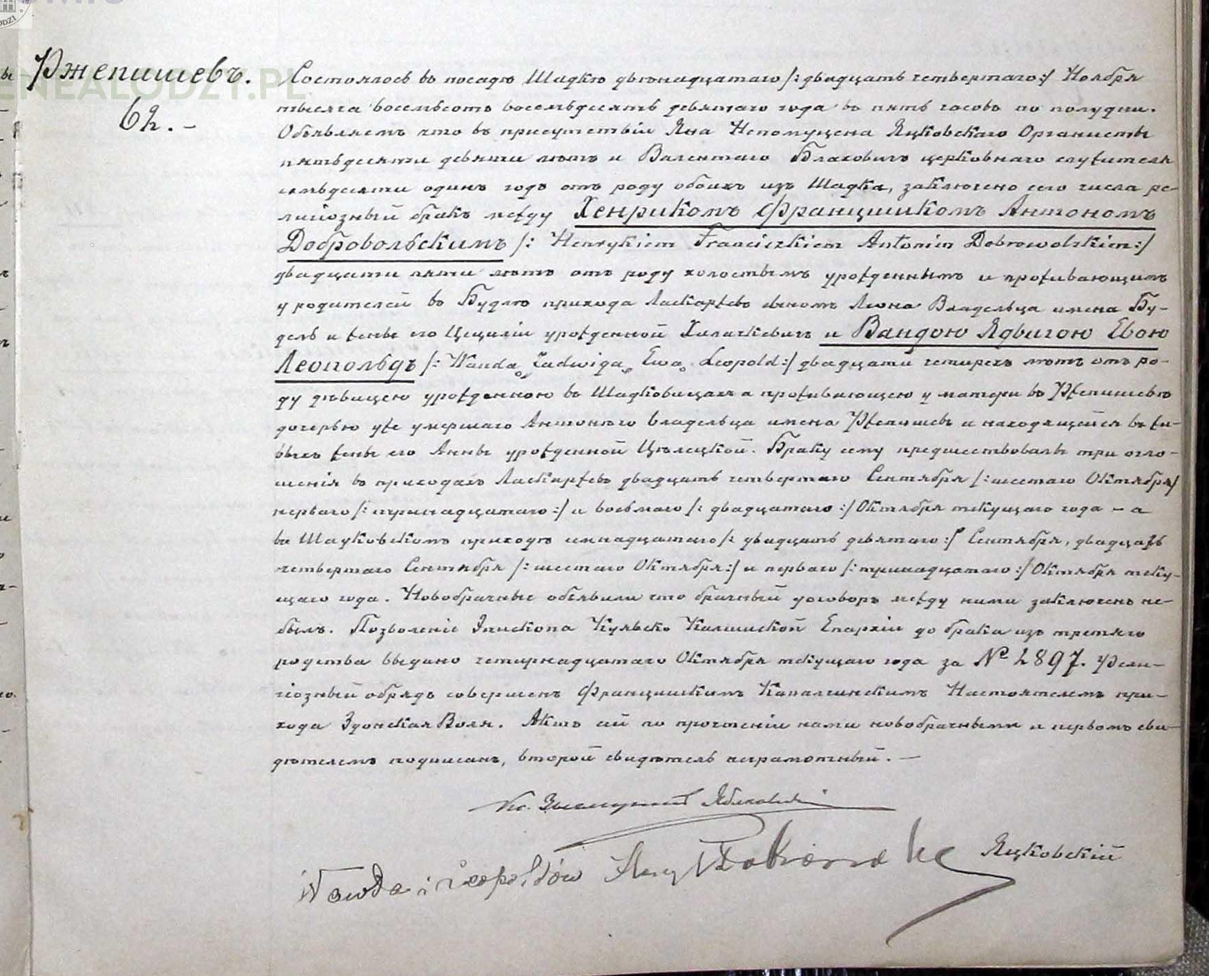 | sw.574803 | m | Henryk | Franciszek | Antoni | | | | | | | | Akt małżeństwa: Szadek (obecn. woj. łódz.), 62/1889 [indeks na http://geneteka.genealodzy.pl/] http://metryki.genealodzy.pl/metryki.php?op=kt&ar=3&zs=1691d&sy=1889&kt=2 [podgląd] |