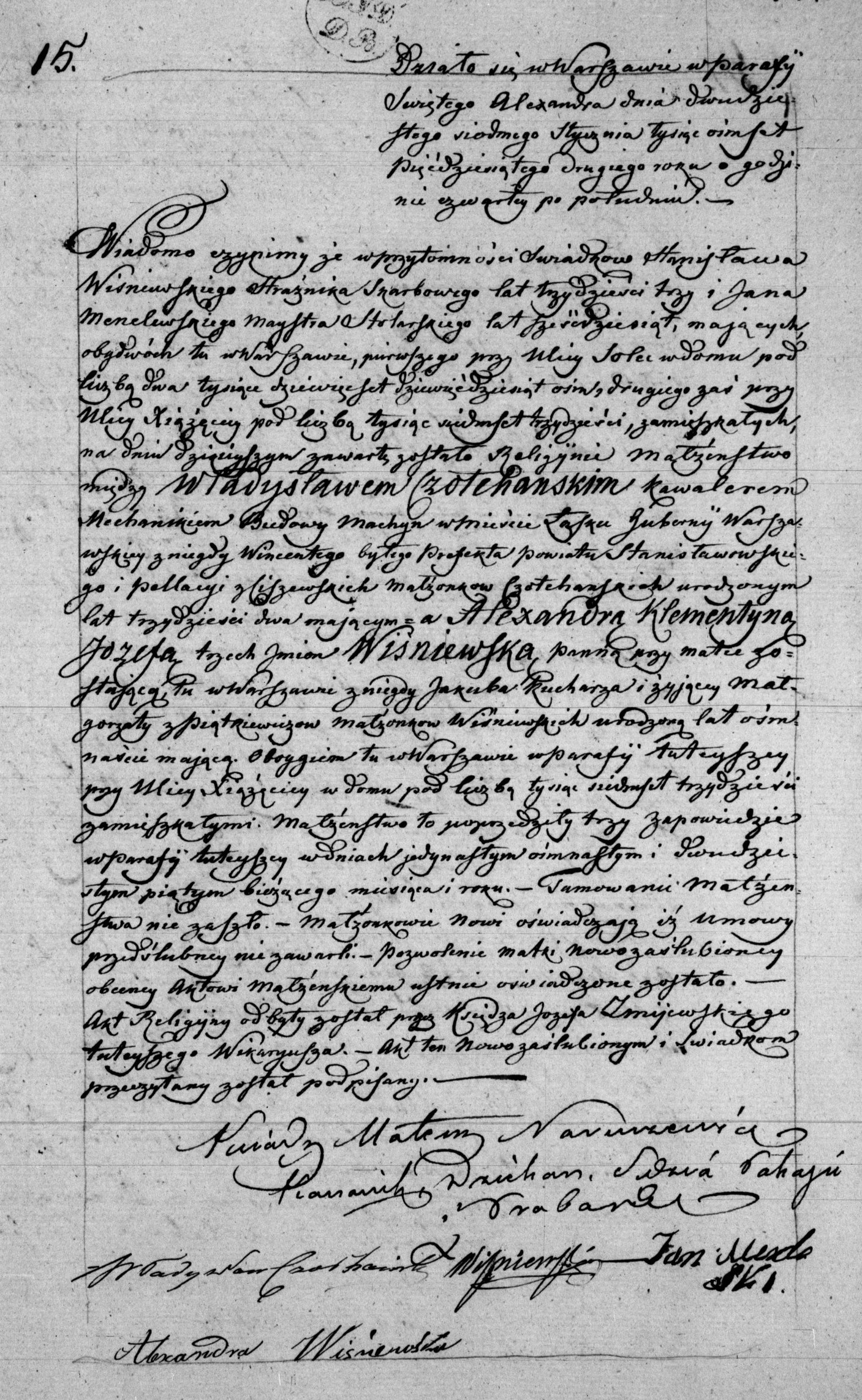 | sw.623705 | | | 1821 | | | | rodzi mu się dziecko | Akt małżeństwa: Warszawa św. Aleksander (obecn. m. Warszawa), 15/1852 [indeks na http://geneteka.genealodzy.pl/] http://metryki.genealodzy.pl/metryki.php?op=kt&ar=8&zs=9214d&sy=304&kt=3 [podgląd] |