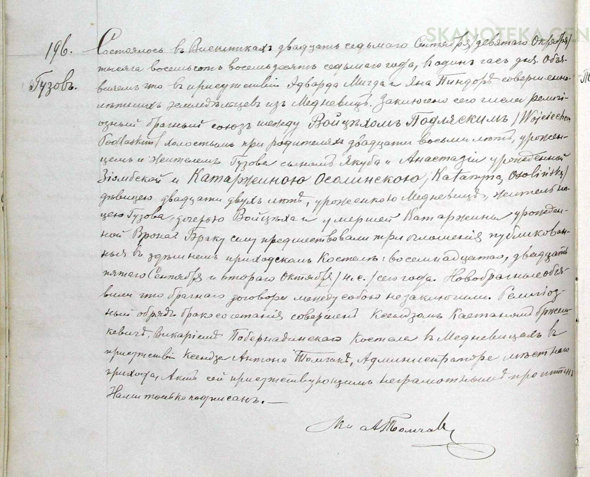 | sw.1286767 | sw.399185 (sw.399185) | sw.399186 (sw.399186) | Akt małżeństwa: Wiskitki (obecn. woj. mazow.), 196/1887 [indeks na http://geneteka.genealodzy.pl/] https://metryki.genealodzy.pl/id43-sy1887-kt2 [podgląd] |