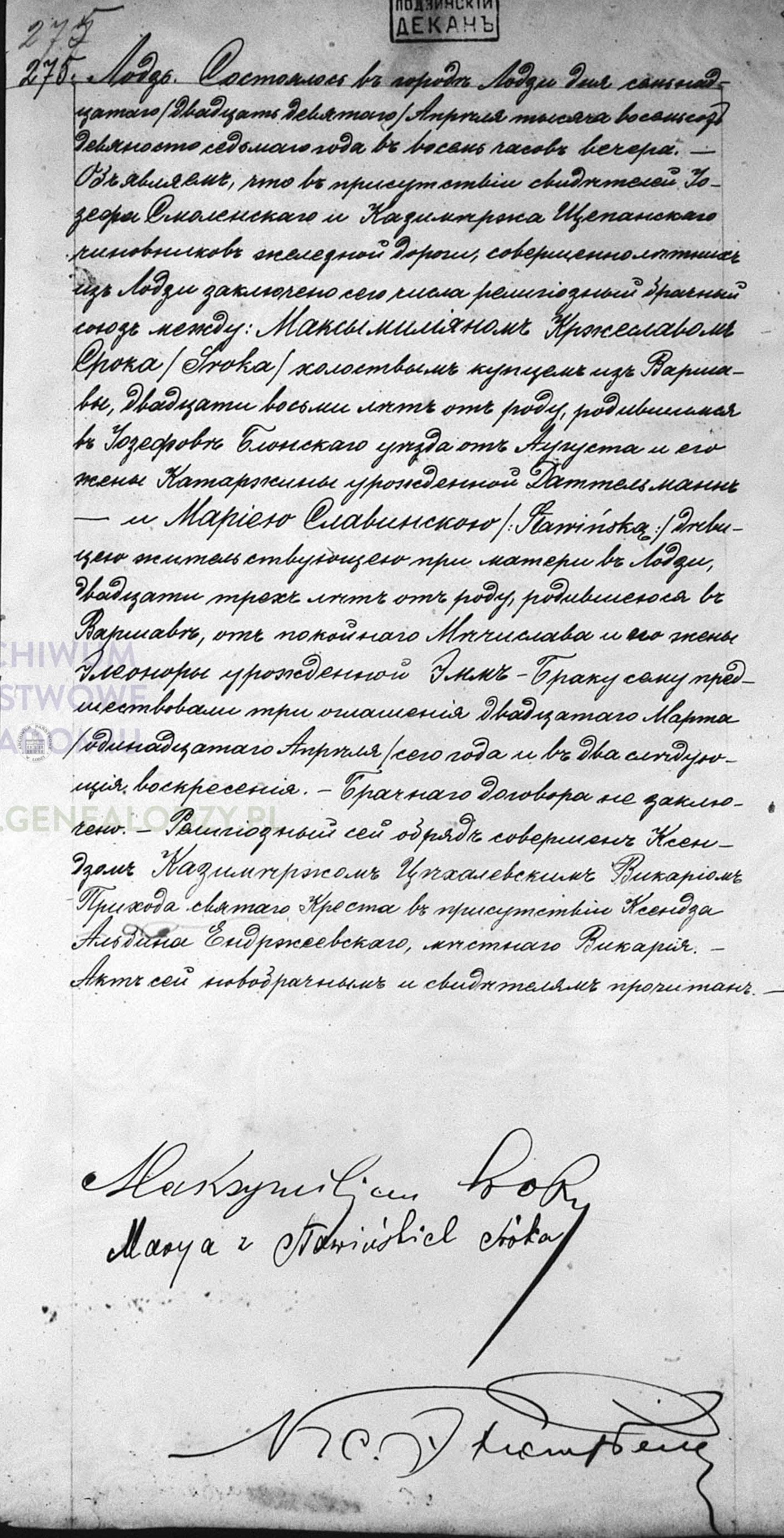 | sw.668124 | sw.668124 | sw.665671 (sw.665671) | sw.665672 (sw.665672) | Akt małżeństwa: Łódź NMP (obecn. woj. łódz.), 275/1897 [indeks na http://geneteka.genealodzy.pl/] http://metryki.genealodzy.pl/metryki.php?op=kt&ar=3&zs=1562d&sy=1897&kt=3 [podgląd] |