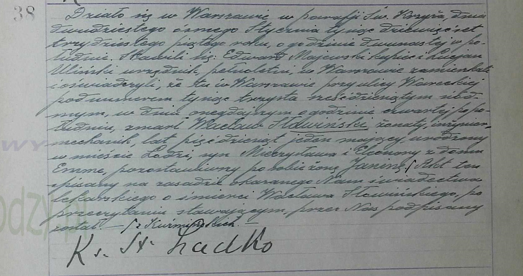 | sw.667813 | sw.883733 | sw.665671 (sw.665671) | sw.665672 (sw.665672) | Akt małżeństwa: Łódź św. Krzyż (obecn. woj. łódz.), 103/1920 [indeks na http://geneteka.genealodzy.pl/] http://metryki.genealodzy.pl/metryki.php?op=kt&ar=3&zs=1563d&sy=1920b&kt=1 [podgląd] |