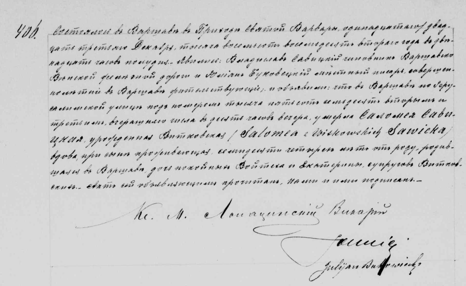 | sw.1018435 | f | Salomea | Amalia | | | | | | | | | Akt urodzenia: Warszawa ASC Cyrkuł I (obecn. m. Warszawa), 298/1808 [indeks na http://geneteka.genealodzy.pl/] http://szukajwarchiwach.pl/72/183/0/-/4#tabJednostka |