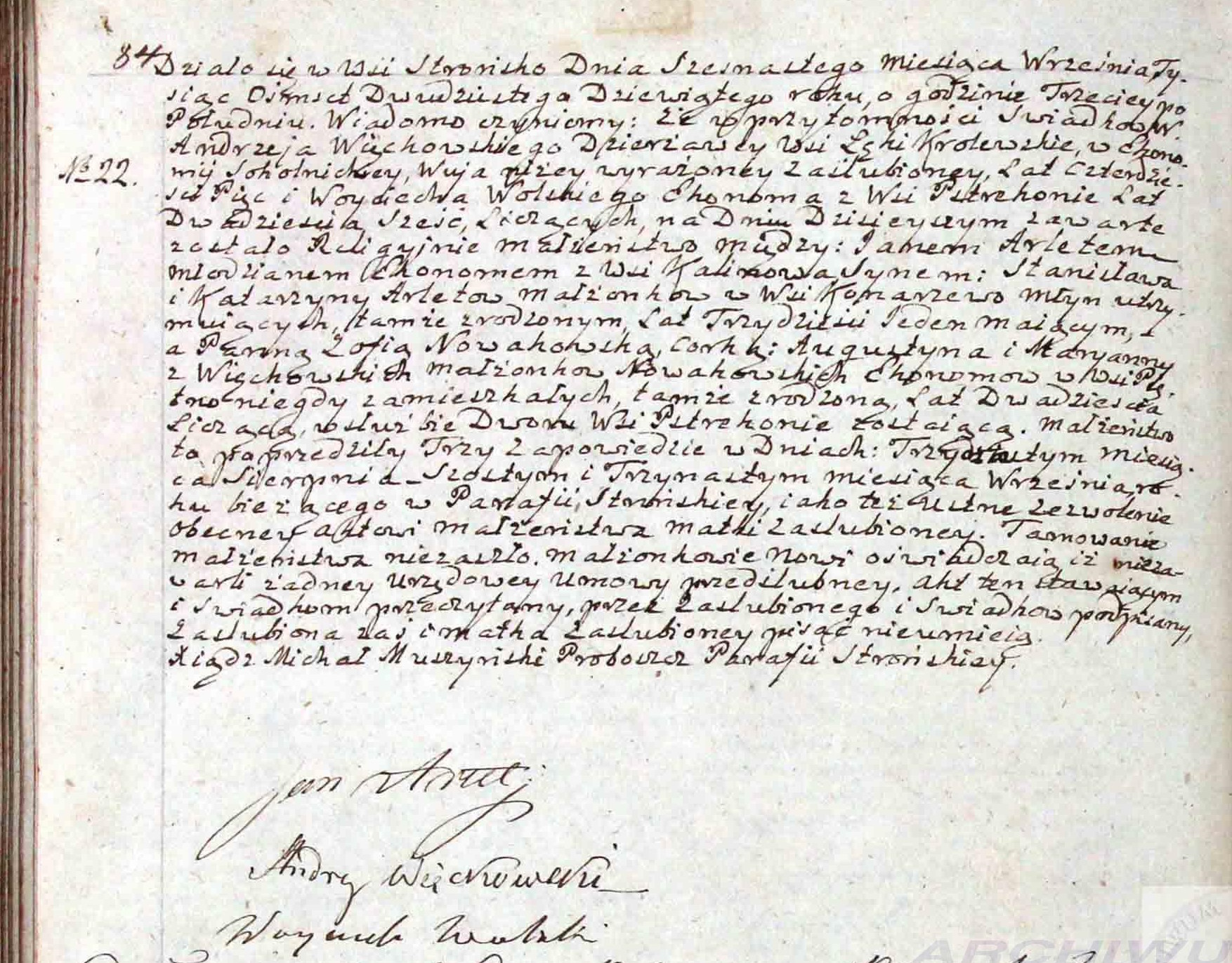 | sw.688830 | sw.688831 (sw.688831) | 16 | sep | 1829 | xpar.3288 | Akt małżeństwa: Strońsko (obecn. woj. łódz.), rok 1829, nr aktu 22 [indeks na http://geneteka.genealodzy.pl/] http://metryki.genealodzy.pl/metryki.php?op=kt&ar=3&zs=1680d&sy=1829&kt=2 [podgląd] | Akt ślubu obecny w bazie Geneteka |