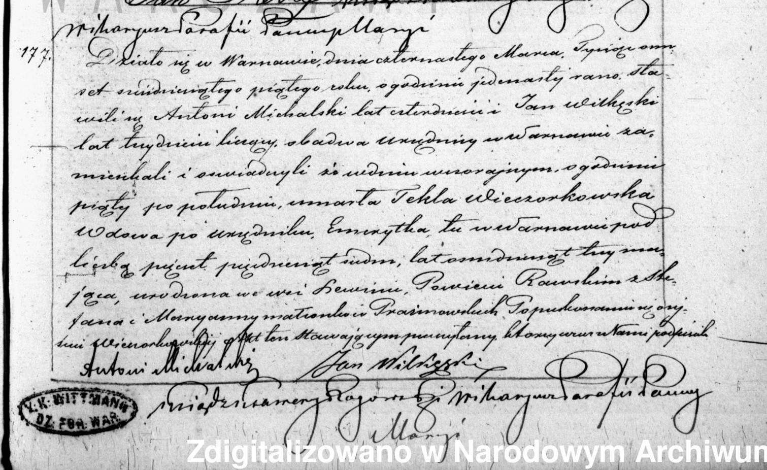 | genetekaz.3442191 | 13 | mar | 1865 | | xpar.1439 | Akt zgonu: Warszawa Nawiedzenie NMP (obecn. m. Warszawa), 177/1865 http://metryki.genealodzy.pl/metryki.php?op=kt&ar=1&zs=0160d&sy=1865&kt=3 [podglad] | | Akt zgonu obecny w bazie Geneteka |