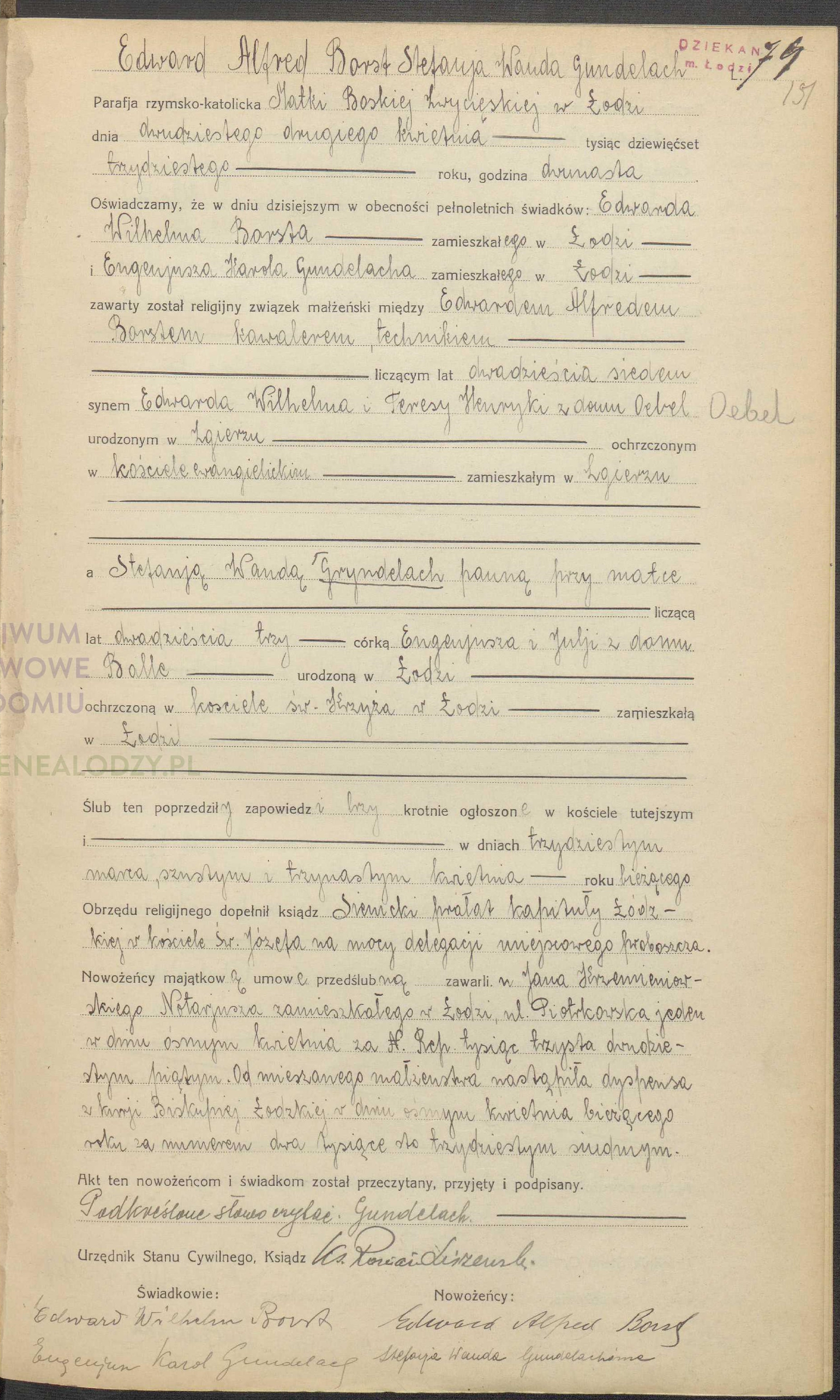 | sw.1282622 | sw.1282622 | sw.743870 (sw.743870) | sw.743871 (sw.743871) | Akt małżeństwa: Łódź św. Józef (obecn. woj. łódz.), 178/1933 [indeks na http://geneteka.genealodzy.pl/] http://metryki.genealodzy.pl/metryki.php?op=kt&ar=3&zs=2474d&sy=1933b&kt=1 [podgląd] |