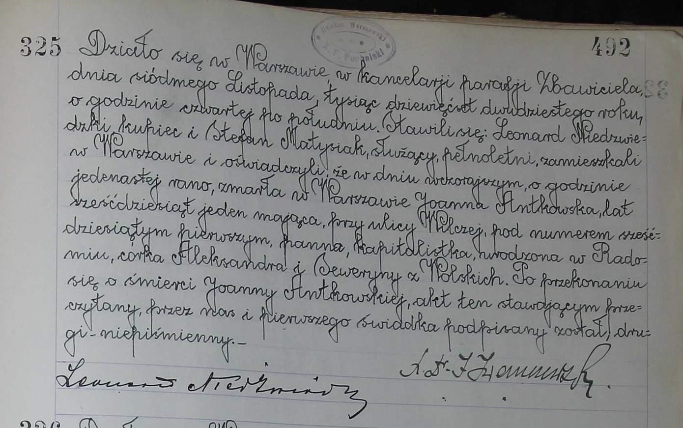 | sw.1046362 | sw.1046362 | 1.146.5 (1.146.5) | sw.747438 (sw.747438) | Akt zgonu: Warszawa Najświętszego Zbawiciela (obecn. m. Warszawa), 325/1920 [indeks na http://geneteka.genealodzy.pl/] http://localhost/mjm/zbawiciel_1920_322-327.jpg [podgląd] |