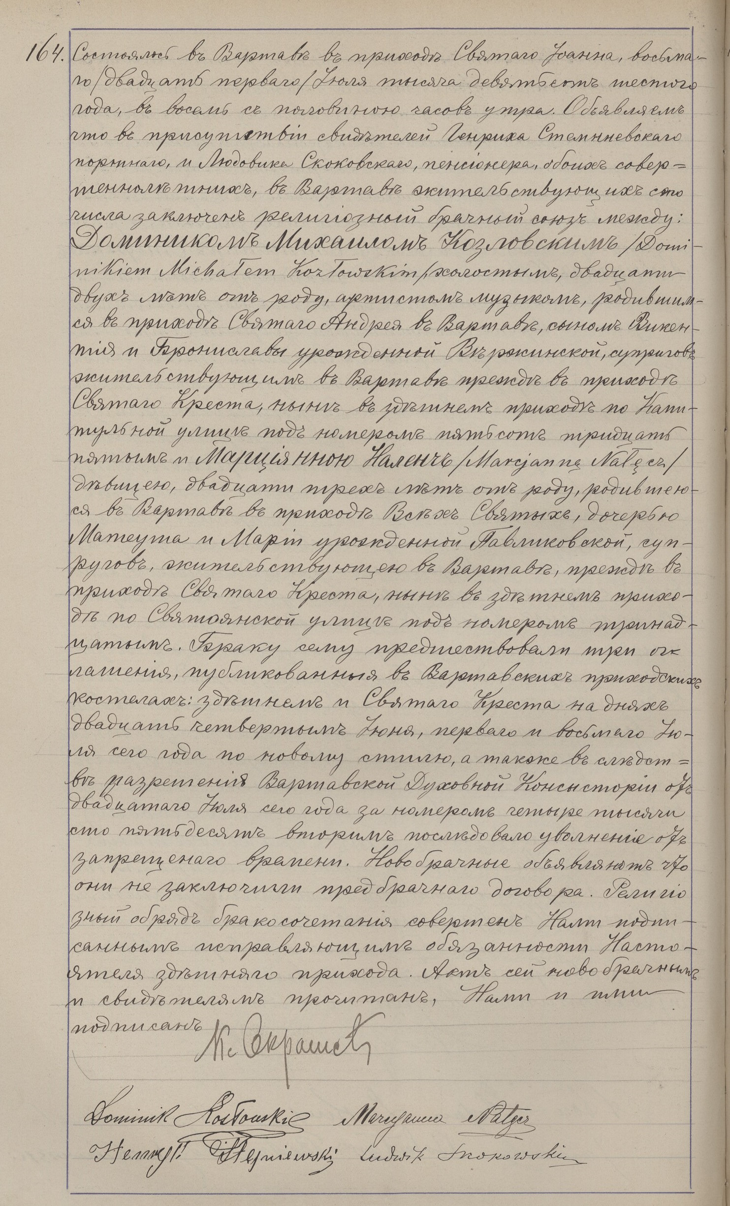| sw.84398 | sw.84640 (sw.84640) | 21 | jul | 1906 | xpar.1448 | Akt małżeństwa: Warszawa św. Jan (obecn. m. Warszawa), rok 1906, nr aktu 164 [indeks na http://geneteka.genealodzy.pl/] http://metryki.genealodzy.pl/metryka.php?ar=1&zs=0161d&sy=1906b&kt=2&skan=164-165.jpg [podgląd] | Akt ślubu obecny w bazie Geneteka |
