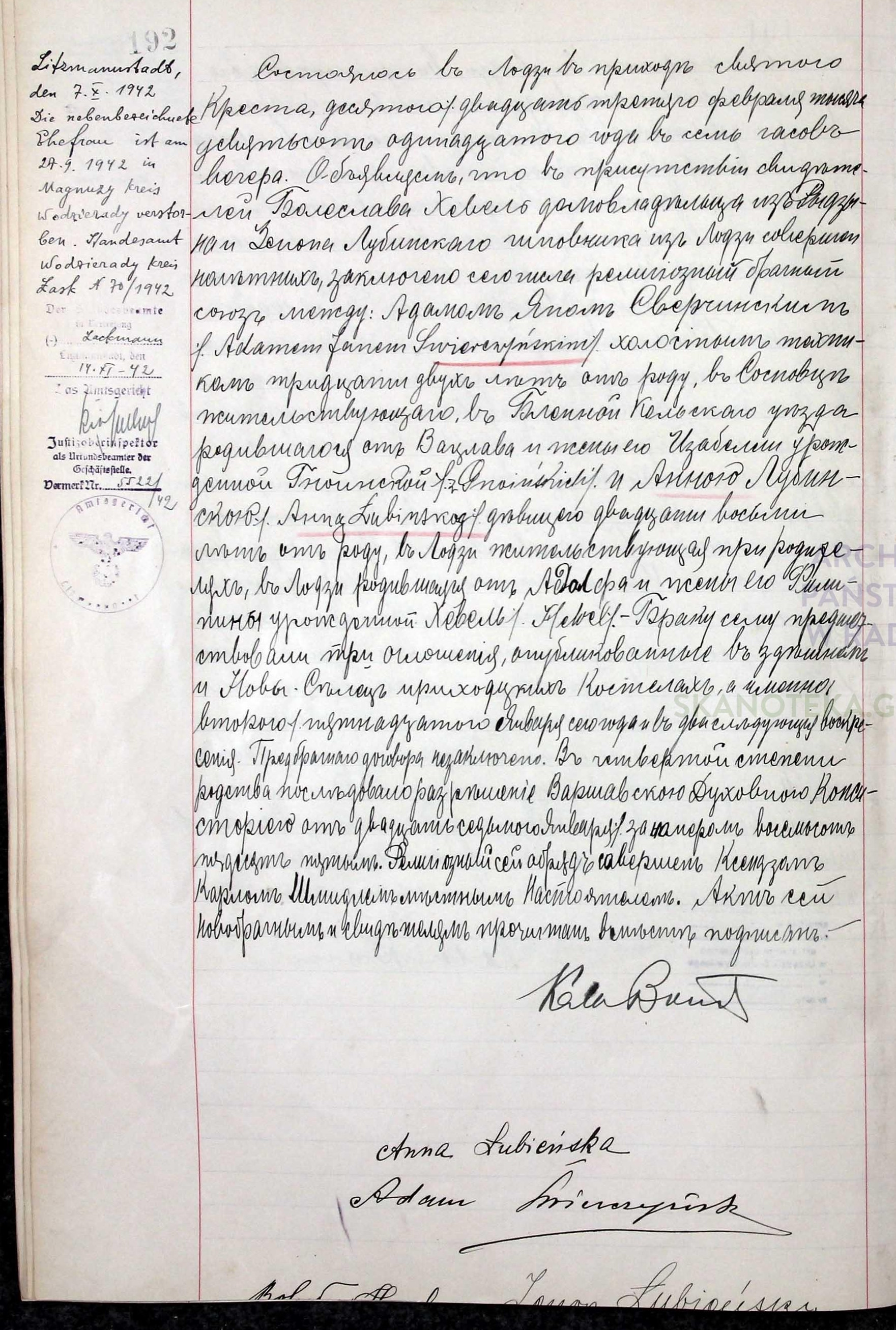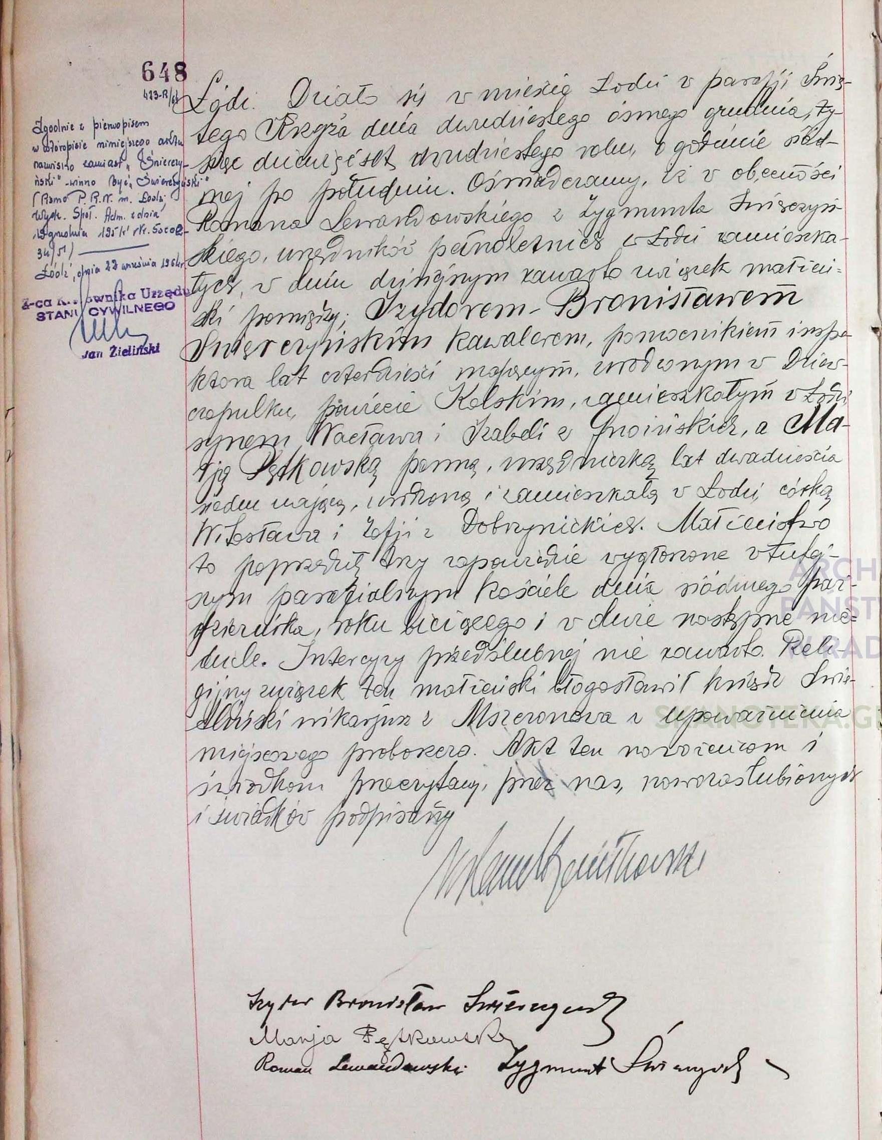 | sw.874736 | sw.874736 | sw.862362 (sw.862362) | sw.862363 (sw.862363) | Akt małżeństwa: Łódź św. Krzyż (obecn. woj. łódz.), 648/1920 [indeks na http://geneteka.genealodzy.pl/] http://metryki.genealodzy.pl/metryki.php?op=kt&ar=3&zs=1563d&sy=1920b&kt=1 [podgląd] |