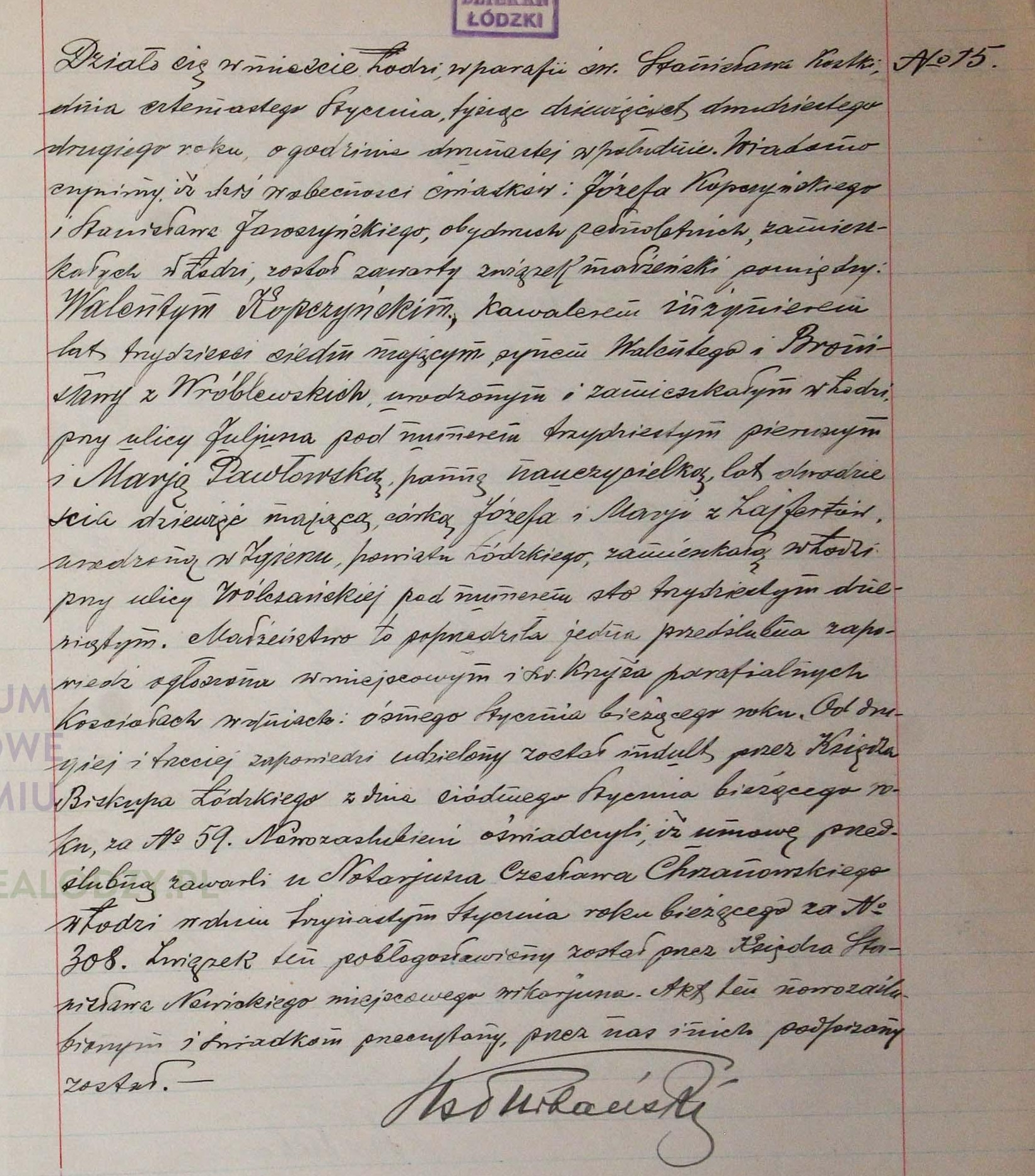 | sw.923440 | sw.874626 (sw.874626) | sw.874627 (sw.874627) | Akt małżeństwa: Zgierz (obecn. woj. łódz.), 49/1891 [indeks na http://geneteka.genealodzy.pl/] http://metryki.genealodzy.pl/metryki.php?op=kt&ar=3&zs=1748d&sy=1891&kt=2 [podgląd] |