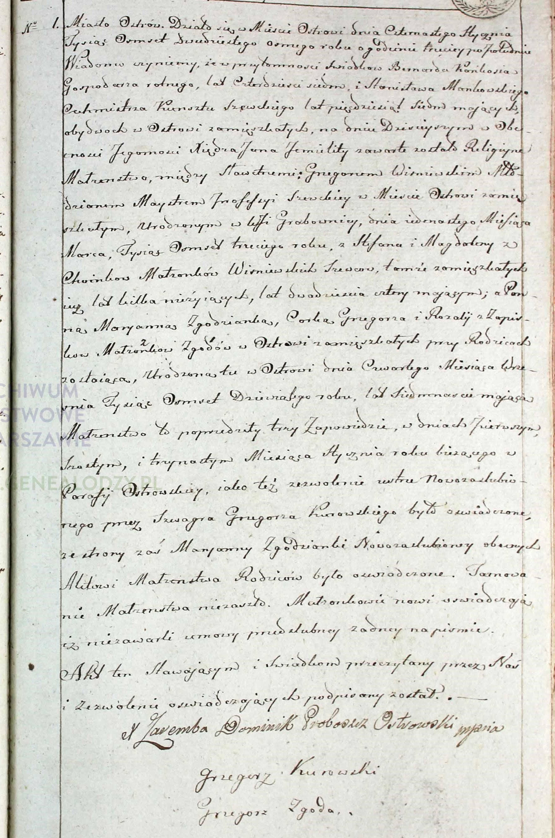 | sw.928288 | sw.928287 (sw.927868) | Akt małżeństwa: Ostrów Mazowiecka (obecn. woj. mazow.), 1/1828 [indeks na http://geneteka.genealodzy.pl/] http://metryki.genealodzy.pl/metryki.php?op=kt&ar=6&zs=0092d&sy=1828&kt=2 [podgląd] |