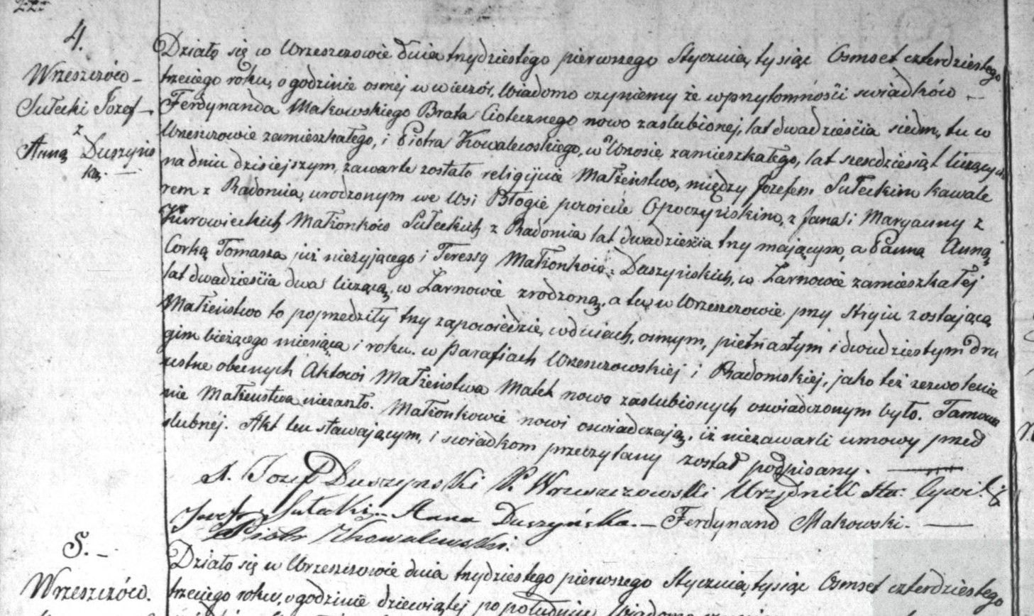 | sw.960747 | sw.960746 (sw.960746) | 1843 | xpar.3699 | Akt małżeństwa: Wrzeszczów (obecn. woj. mazow.), rok 1843, nr aktu 4 [indeks na http://geneteka.genealodzy.pl/] https://szukajwarchiwach.pl/58/172/0/1/18/skan/full/SX3RytQUOfAT-acZcKUaNQ [podgląd] | Akt ślubu obecny w bazie Geneteka |