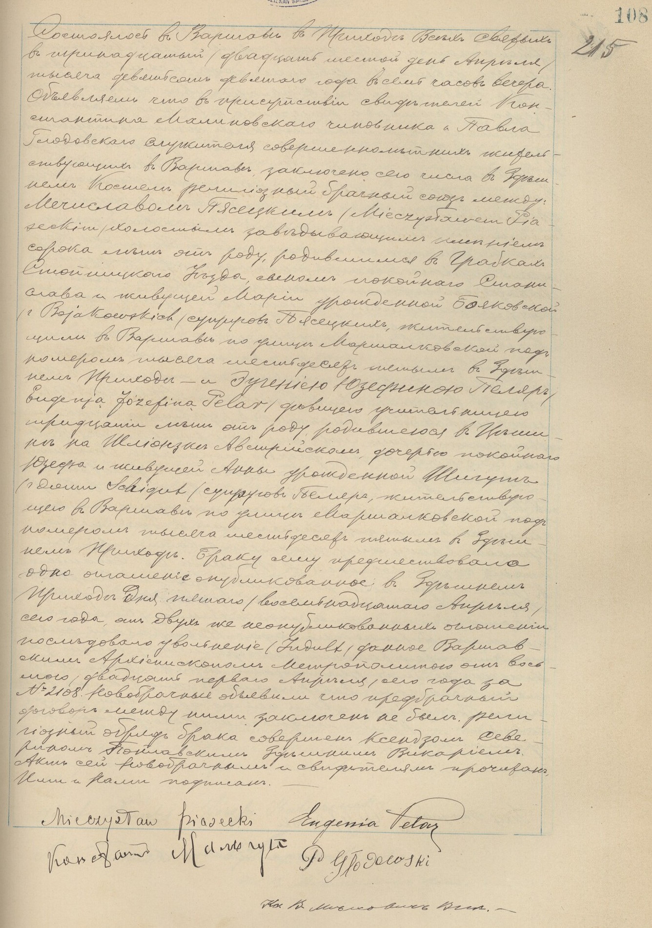 | sw.1157425 | sw.1157425 | sw.970192 (sw.970192) | sw.970193 (sw.970193) | Akt małżeństwa: Warszawa Wsz. Św. (obecn. m. Warszawa), 215/1909 [indeks na http://geneteka.genealodzy.pl/] http://metryki.genealodzy.pl/metryka.php?ar=8&zs=9264d&sy=333&kt=1&skan=215.jpg [podgląd] |