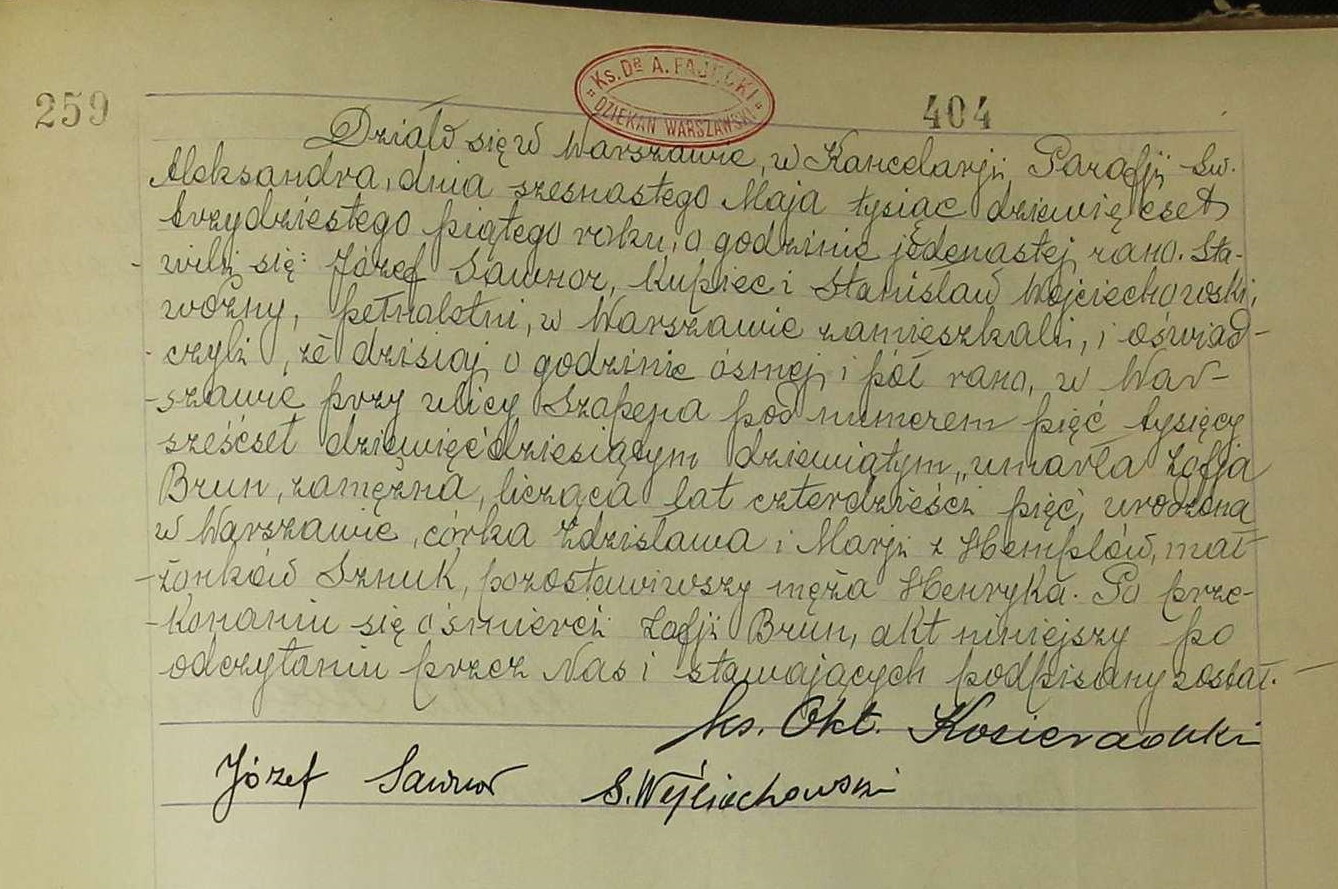 | sw.99905 | sw.99906 (sw.99906) | 21 | nov | 1910 | | xpar.1442 | Akt małżeństwa: Warszawa św. Aleksander (obecn. m. Warszawa), rok 1910, nr aktu 580 [indeks na http://geneteka.genealodzy.pl/] http://metryki.genealodzy.pl/metryka.php?ar=8&zs=9214d&sy=326&kt=1&skan=580.jpg [podgląd] | | | Akt ślubu obecny w bazie Geneteka |